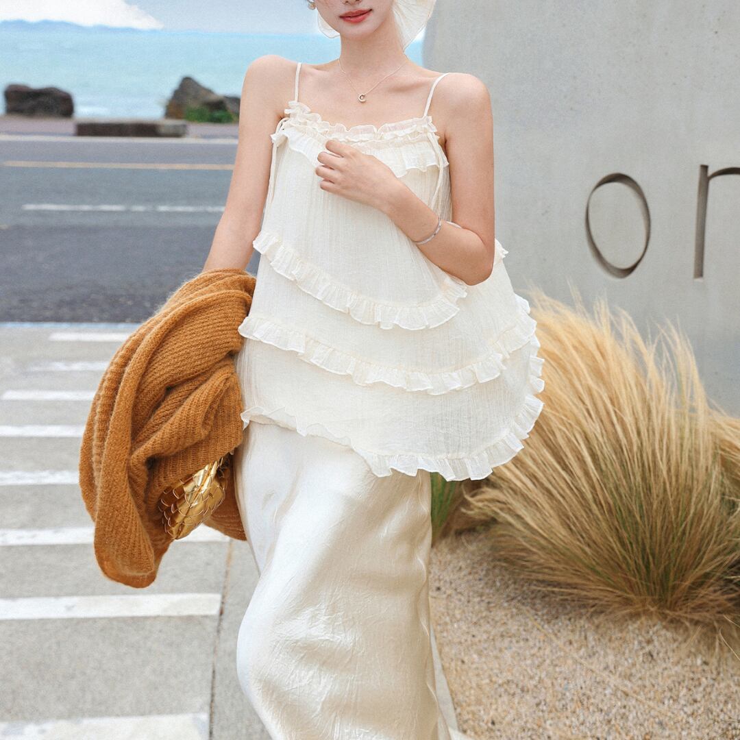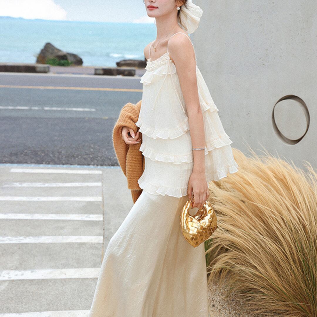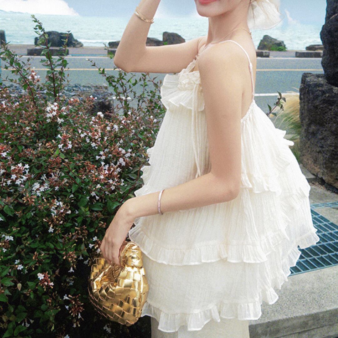 繊細なフリルが段々に重なったデザインがフェミニンな印象を引き立てるキャミトップス。 軽やかな素材で涼しく着られ、夏のリゾートやデートコーデにぴったりな一枚です。 size : S / M / L color : ivory S 着丈62 バスト80 M 着丈63 バスト84 L 着丈64 バスト88 ◾︎ 配送期間 10日〜21日程お時間を頂戴しております。(休業日を除く) ◾︎ 公式LINEお友達追加で¥500 OFFクーポンプレゼント https://lin.ee/6wh2f5z ◾︎ 必ず下記ページの「ご利用ガイド」をお読みの上 ご購入をお願いいたします。 https://babybelle.theshop.jp/blog/2023/11/01/011701