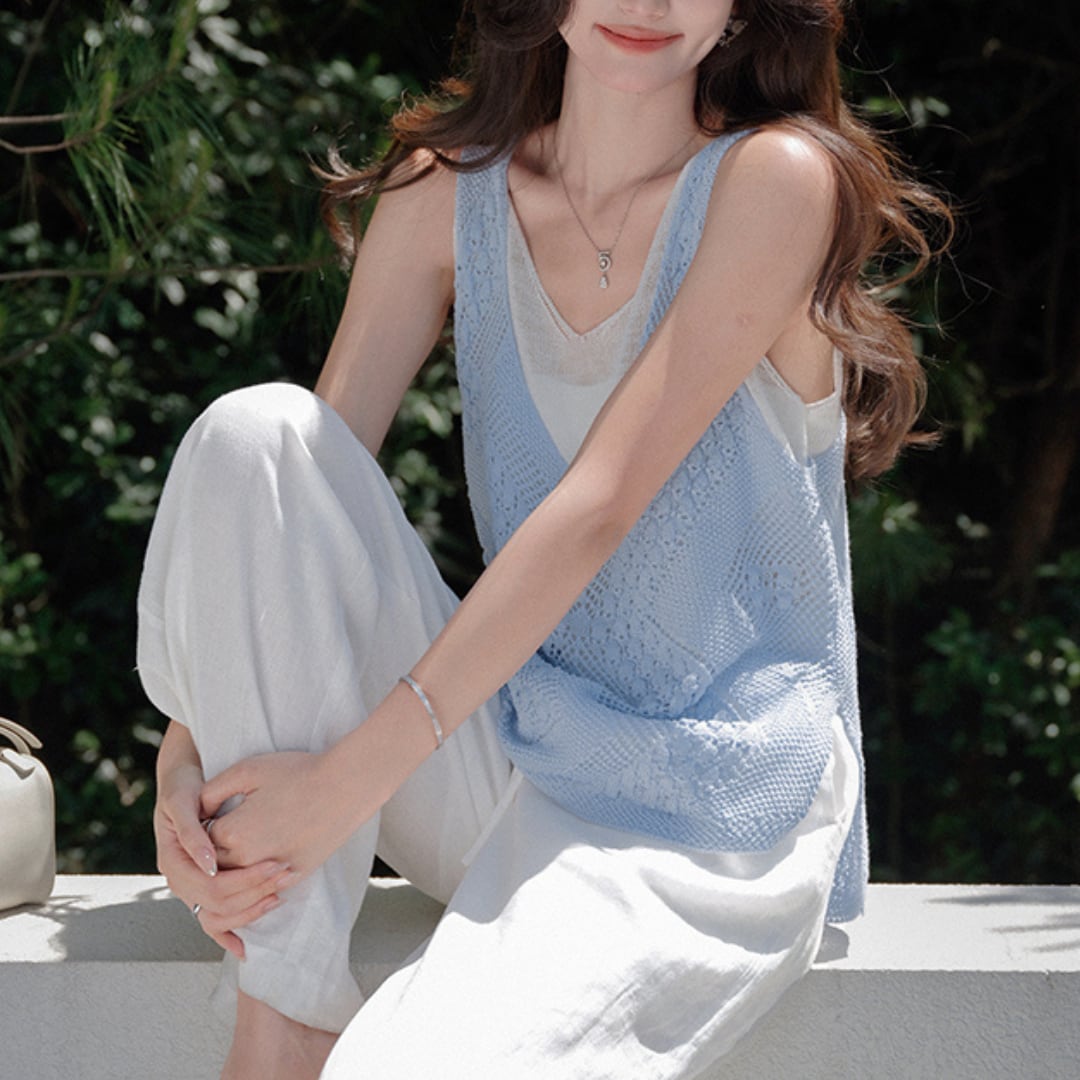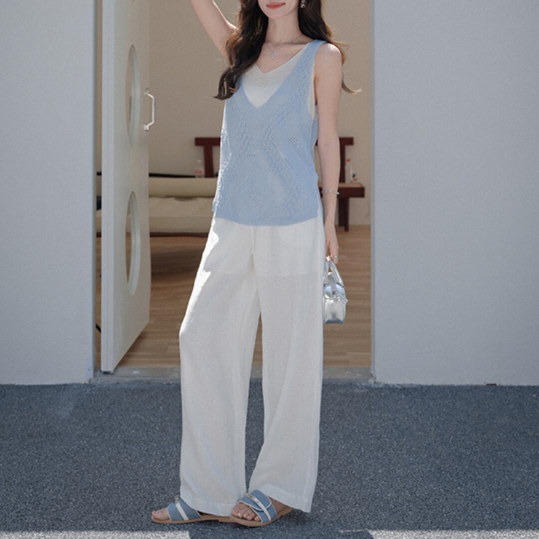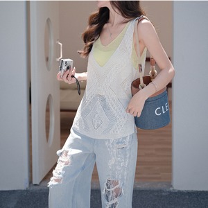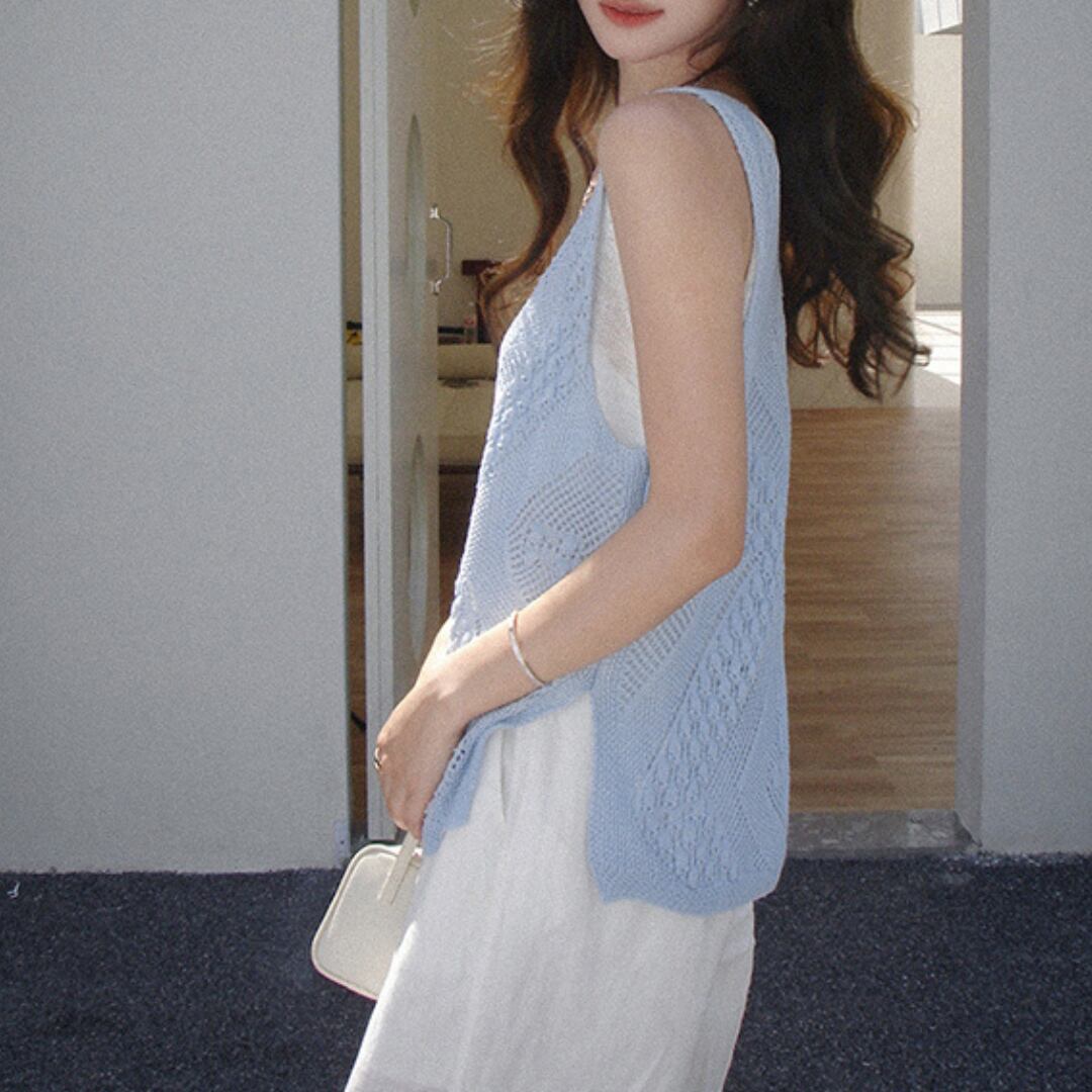 繊細な透かし編みが涼しげな印象を与える、ナチュラルムードのニットタンクトップ。 インナーとのレイヤードが楽しめ、デニムやワイドパンツと合わせて軽やかな夏コーデにぴったりです。 size : S / M color : white / blue / beige S 着丈59 肩幅29 バスト88 M 着丈60 肩幅30 バスト92 ◾︎ 配送期間 10日〜21日程お時間を頂戴しております。(休業日を除く) ◾︎ 公式LINEお友達追加で¥500 OFFクーポンプレゼント https://lin.ee/6wh2f5z ◾︎ 必ず下記ページの「ご利用ガイド」をお読みの上 ご購入をお願いいたします。 https://babybelle.theshop.jp/blog/2023/11/01/011701