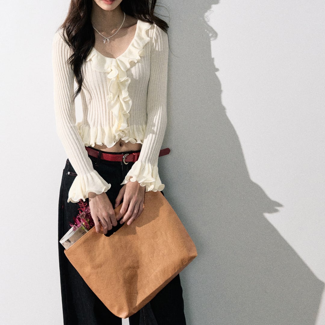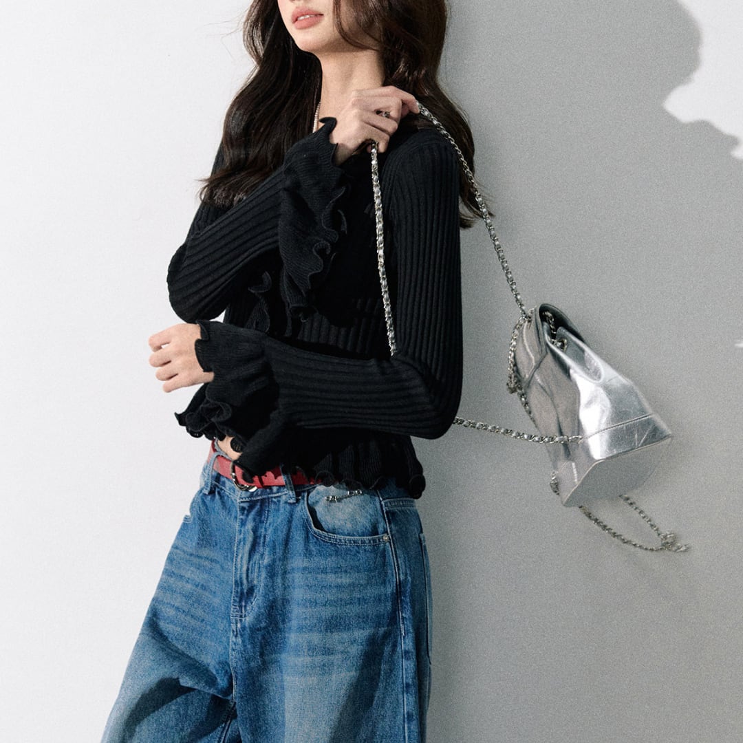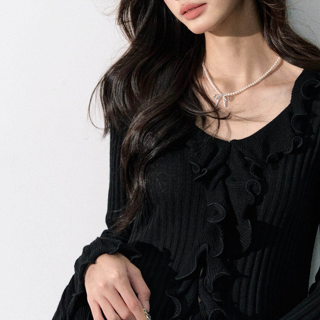 立体感のあるリブ編みと胸元から裾へ流れるフリルデザインが、シンプルな中に華やかな表情をプラス。Vネックラインがデコルテを美しく見せ、喇叭袖のシルエットが手元にやさしいニュアンスを添えます。