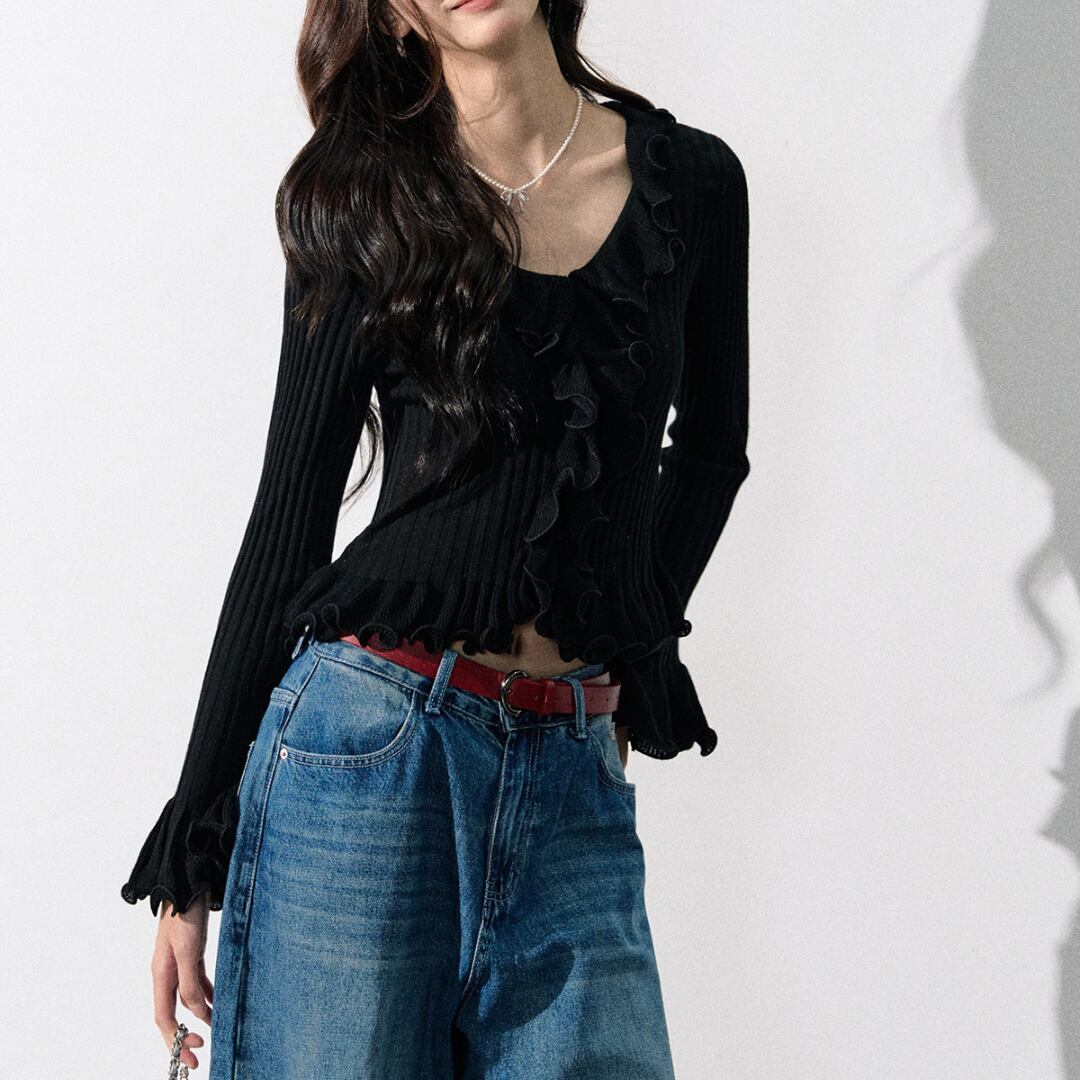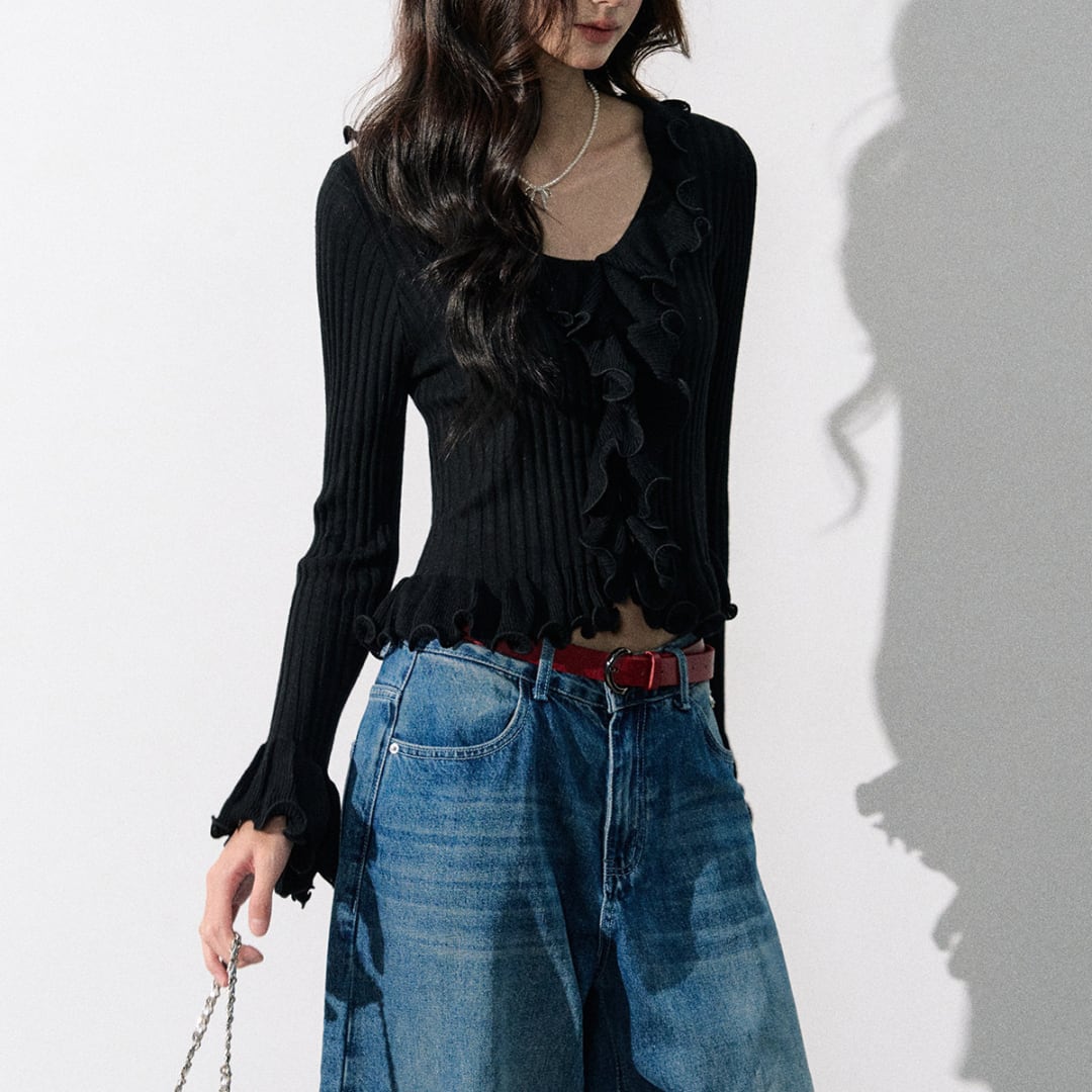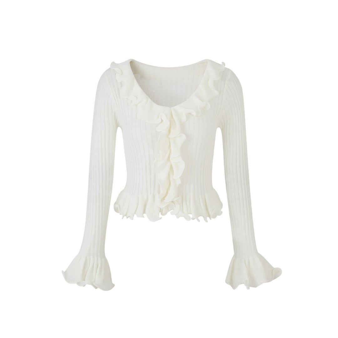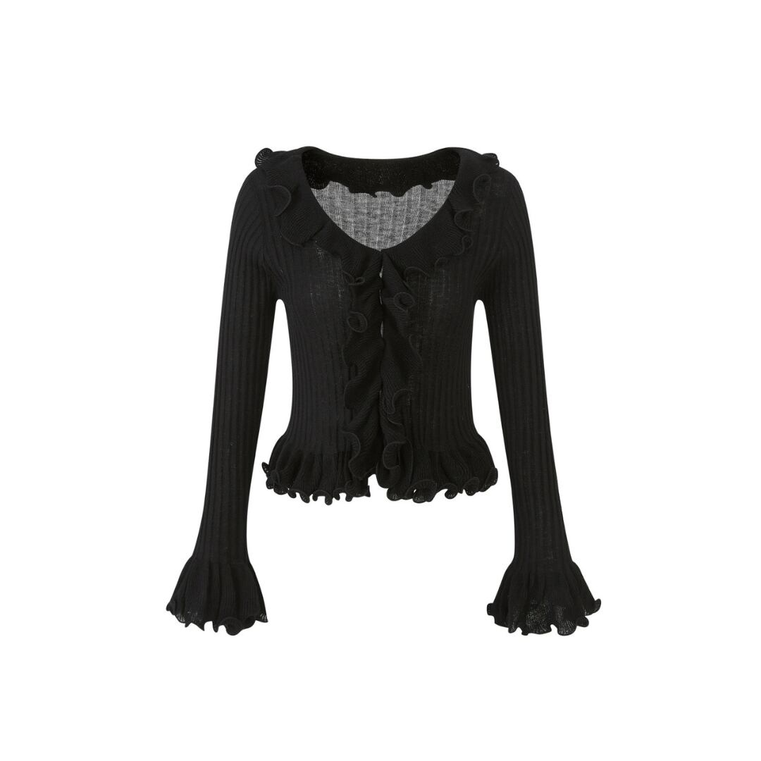 繊細なフリルディテールが印象的な、上品なリブニットカーディガン。柔らかなニット素材と女性らしいシルエットが調和し、落ち着きのある大人の装いを演出します。