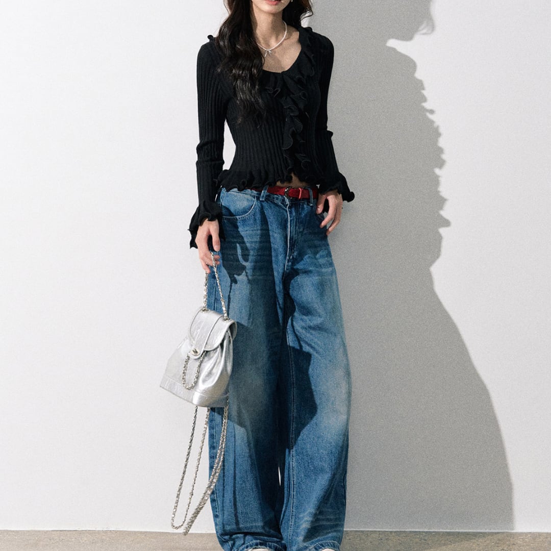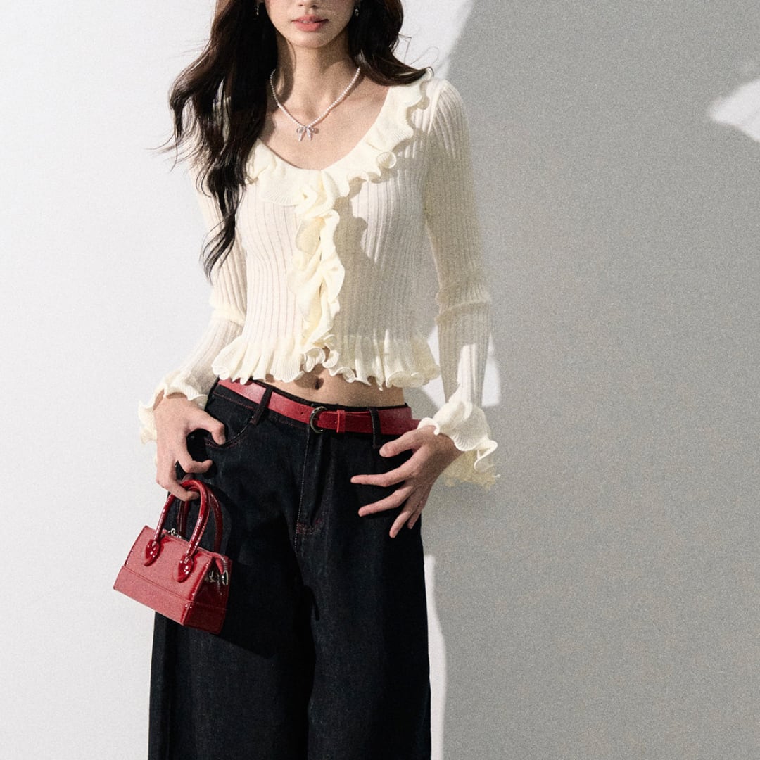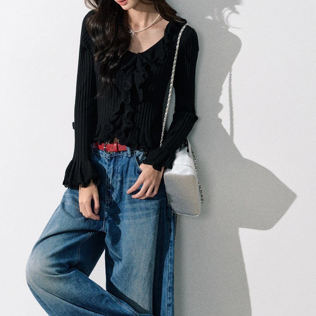 繊細なフリルディテールが印象的な、上品なリブニットカーディガン。柔らかなニット素材と女性らしいシルエットが調和し、落ち着きのある大人の装いを演出します。
