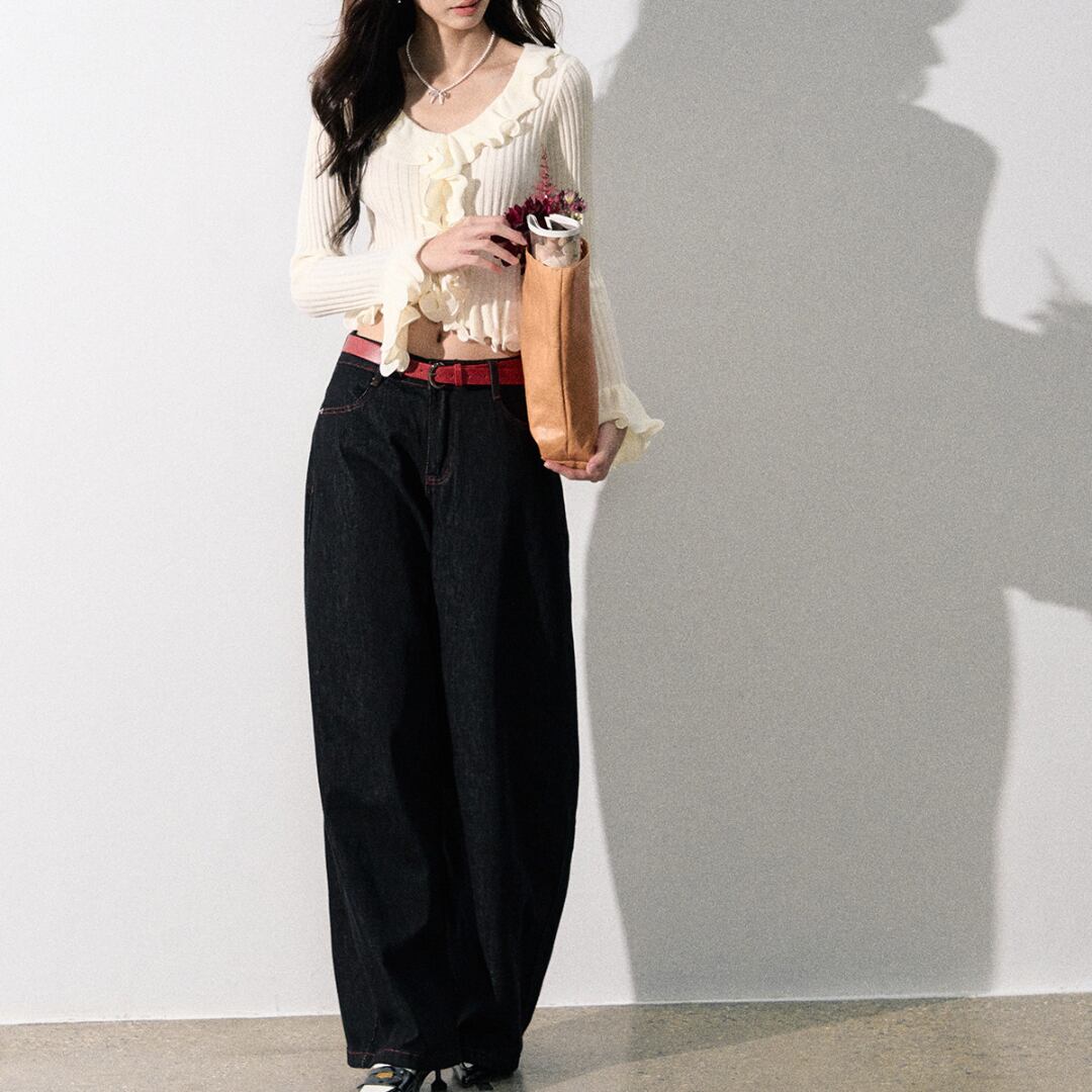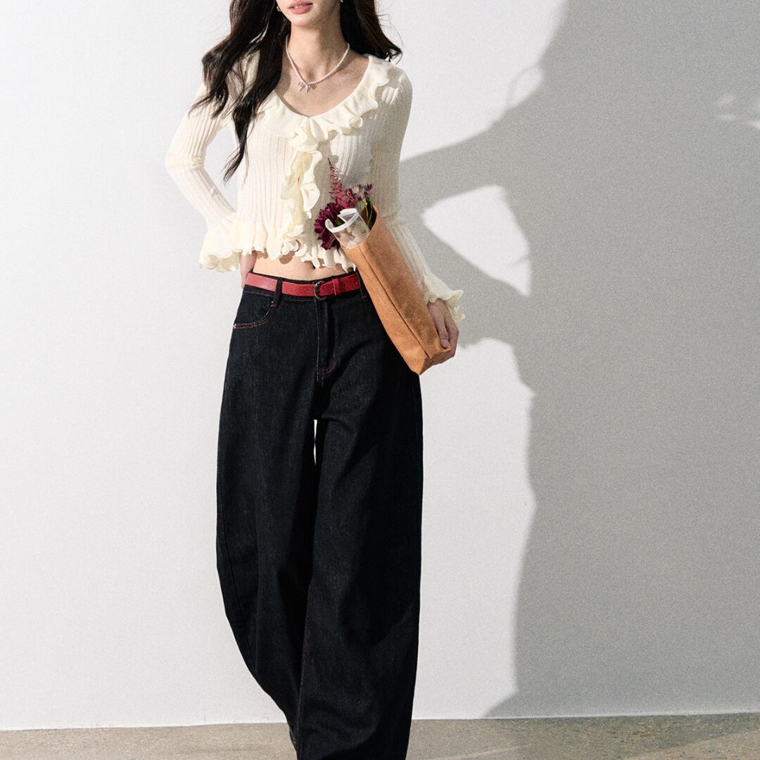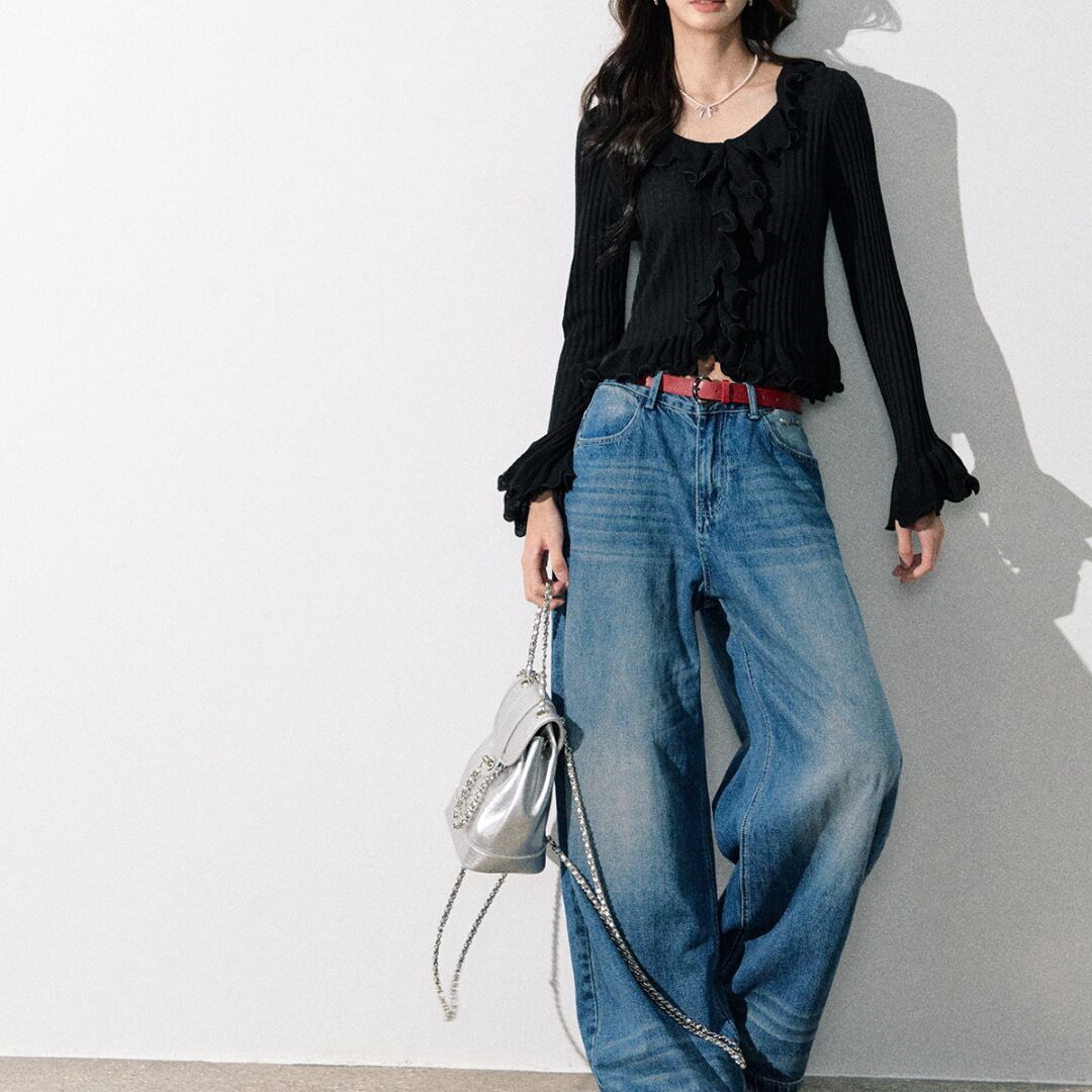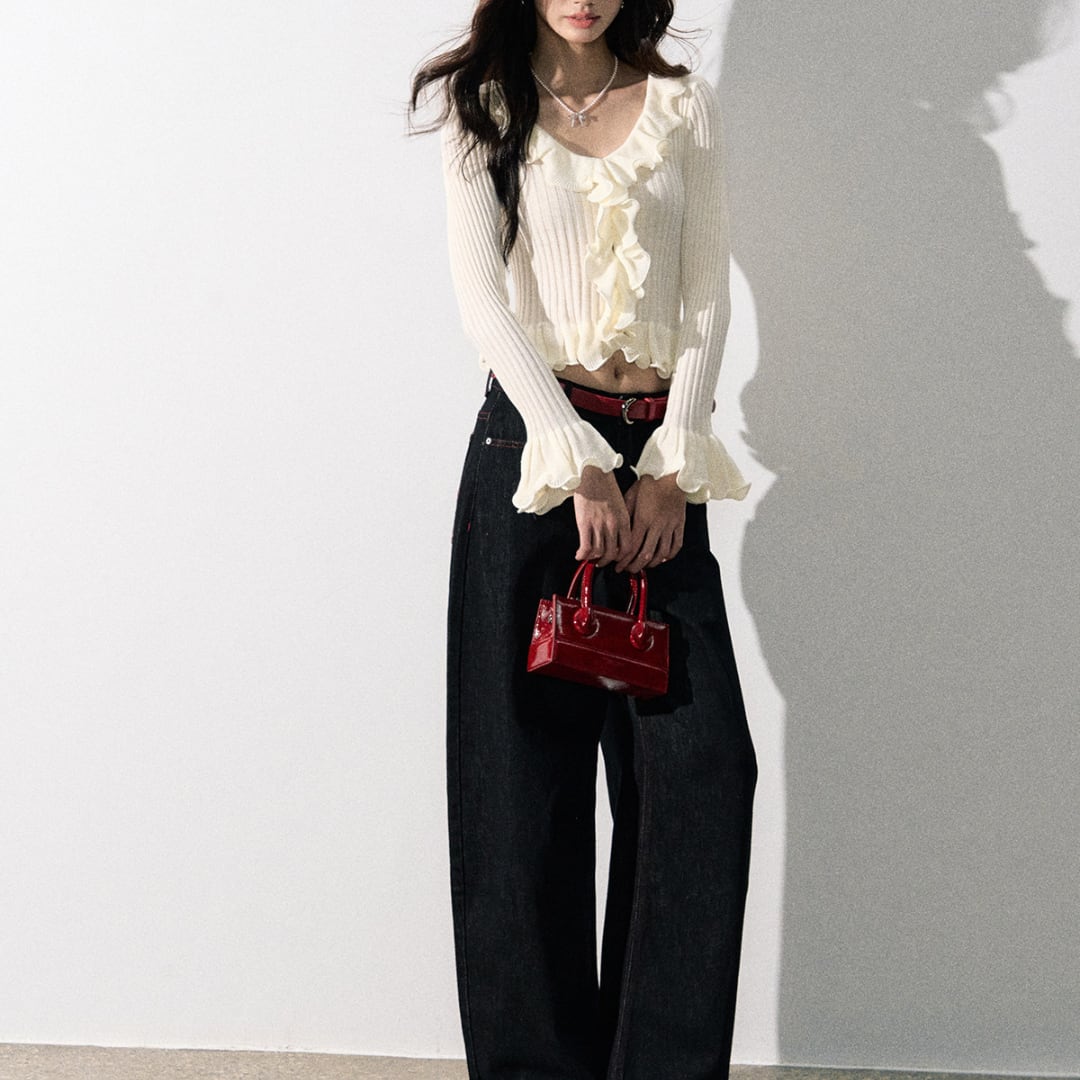 繊細なフリルディテールが印象的な、上品なリブニットカーディガン。柔らかなニット素材と女性らしいシルエットが調和し、落ち着きのある大人の装いを演出します。
