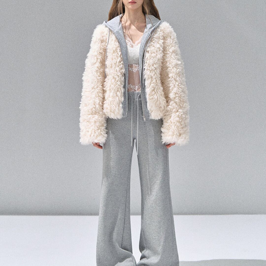 ふんわりとしたボアの質感と、フード付きのジップデザインが程よい立体感を演出。