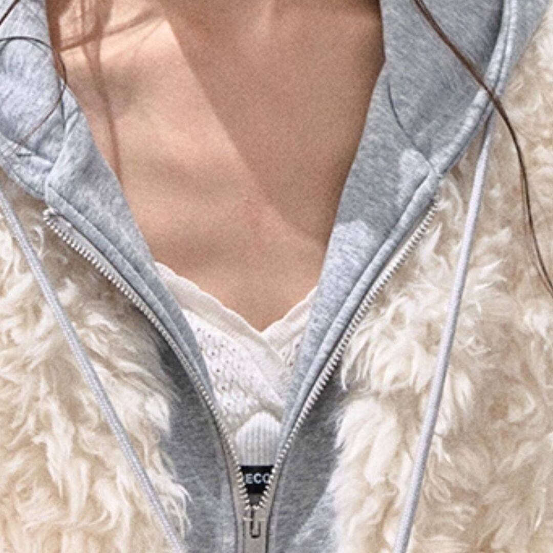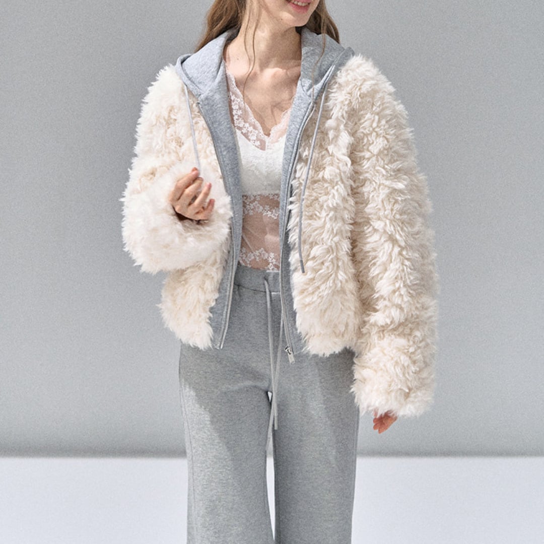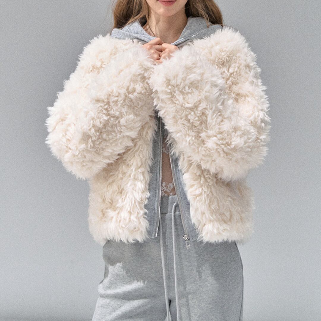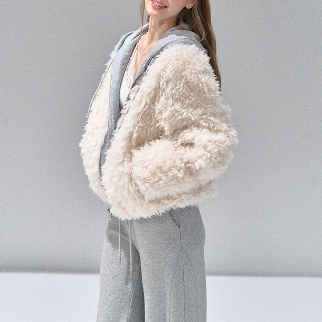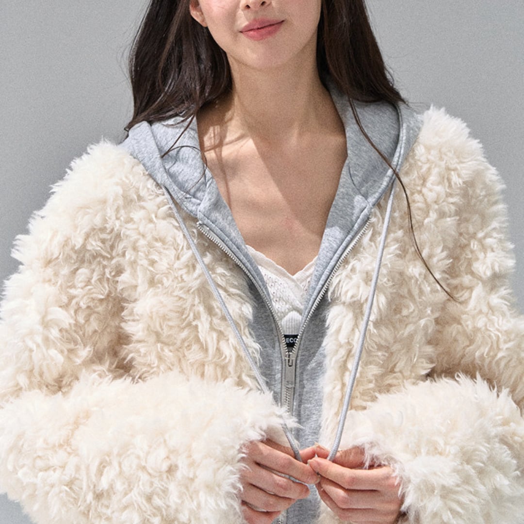 柔らかな表情のボア素材に、フーディーデザインを重ねたレイヤード風ジャケット。