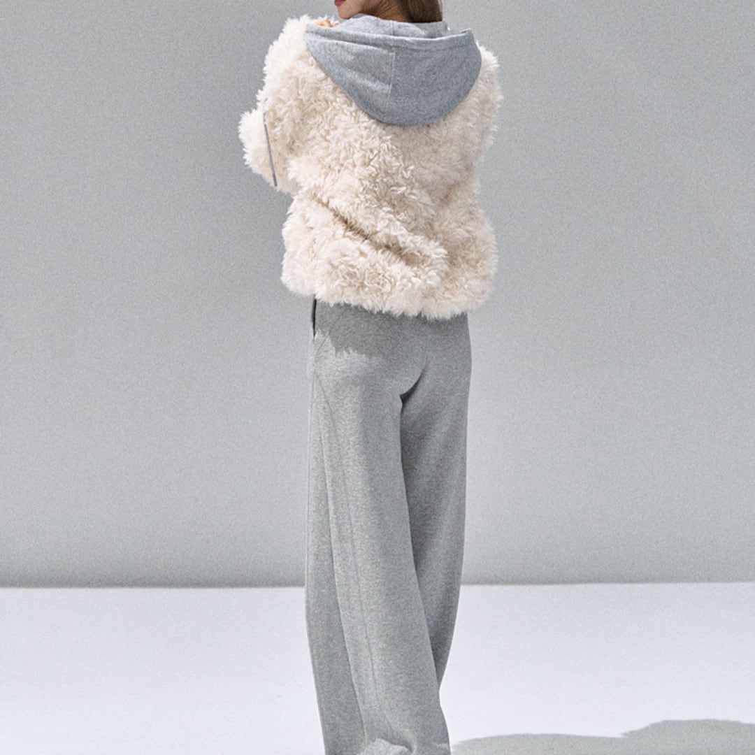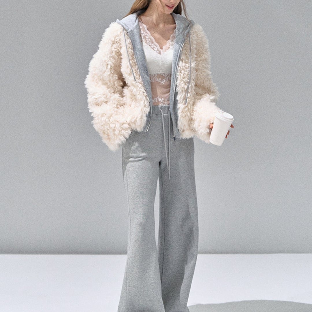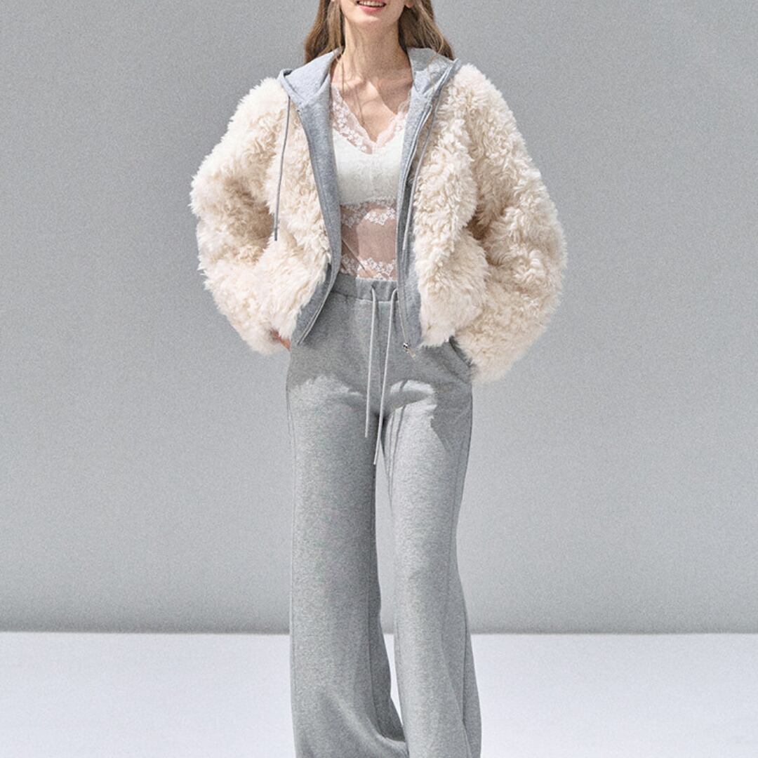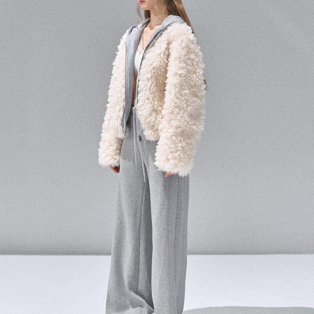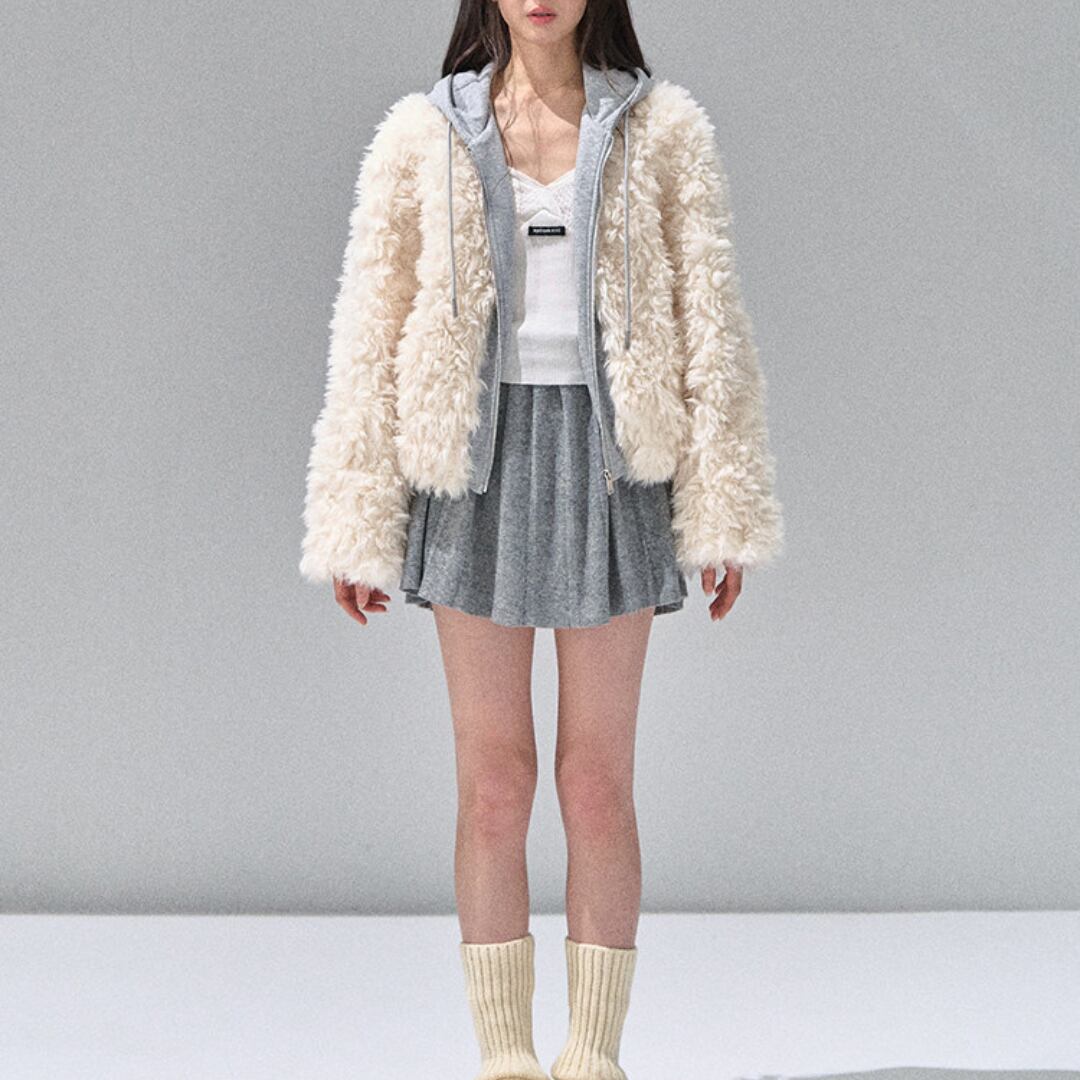 柔らかな表情のボア素材に、フーディーデザインを重ねたレイヤード風ジャケット。