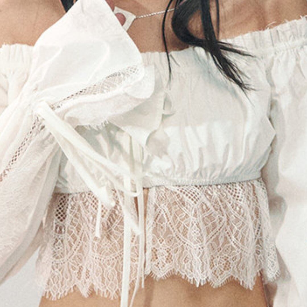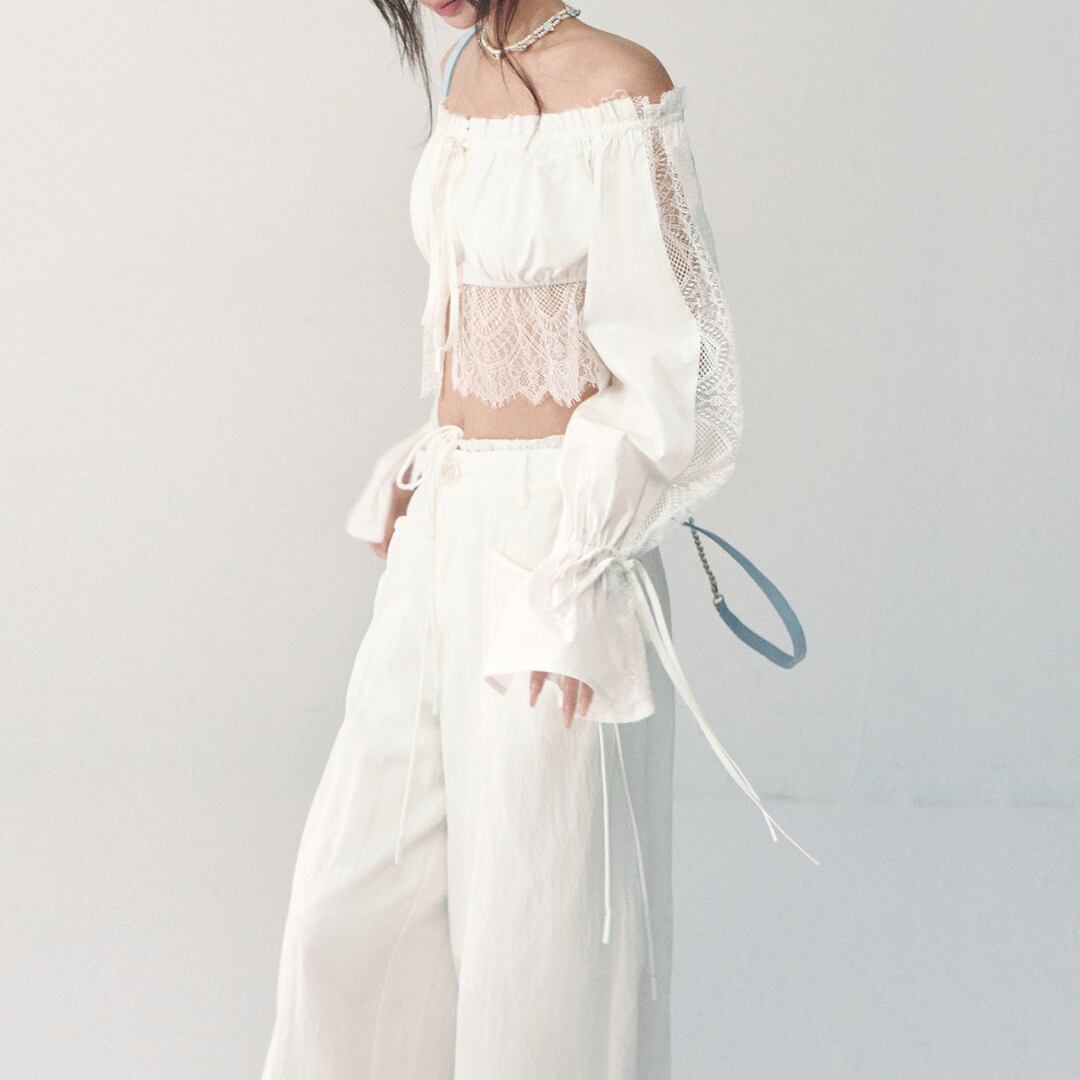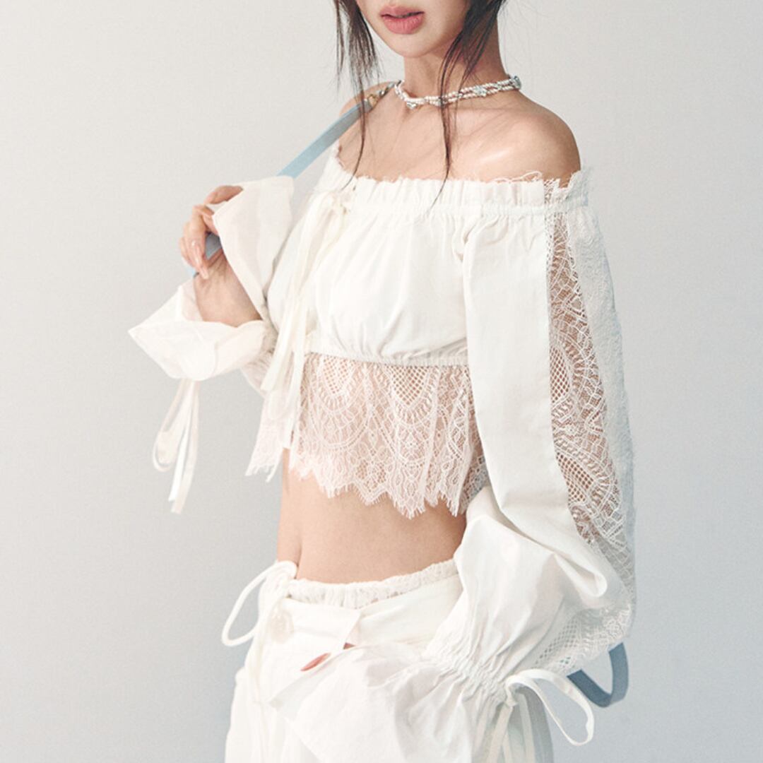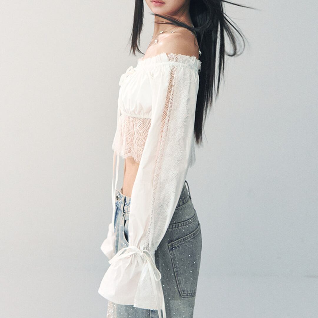 繊細なレースディテールとオフショルダーデザインを組み合わせた、華やかな印象のショートブラウス。