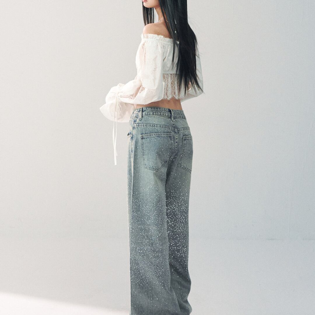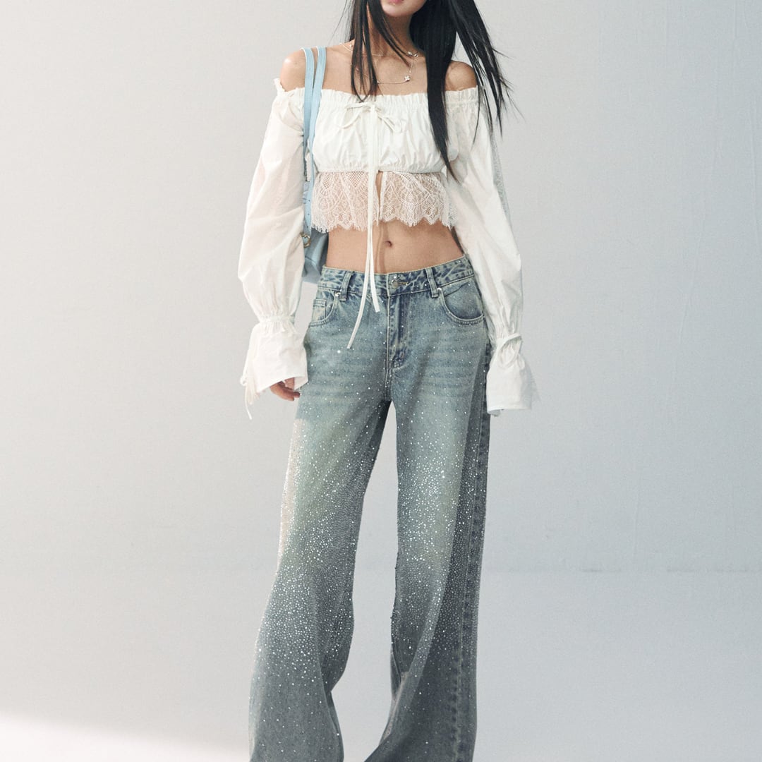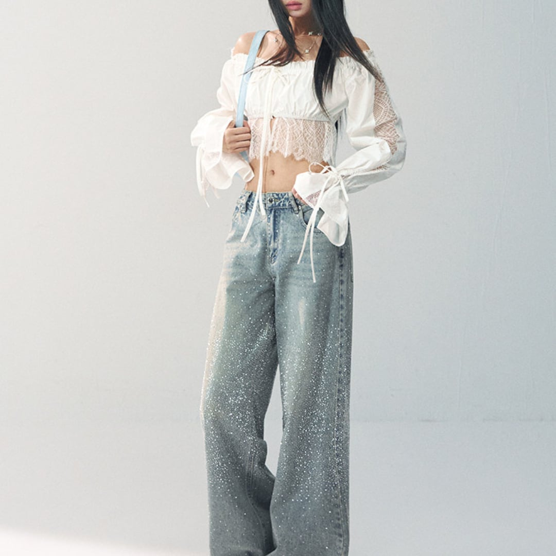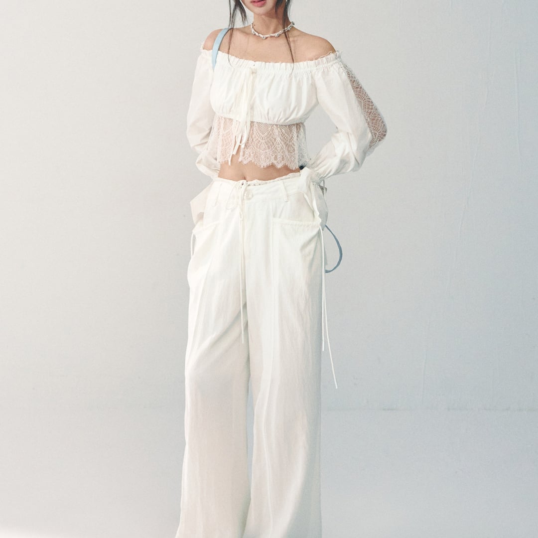 繊細なレースディテールとオフショルダーデザインを組み合わせた、華やかな印象のショートブラウス。