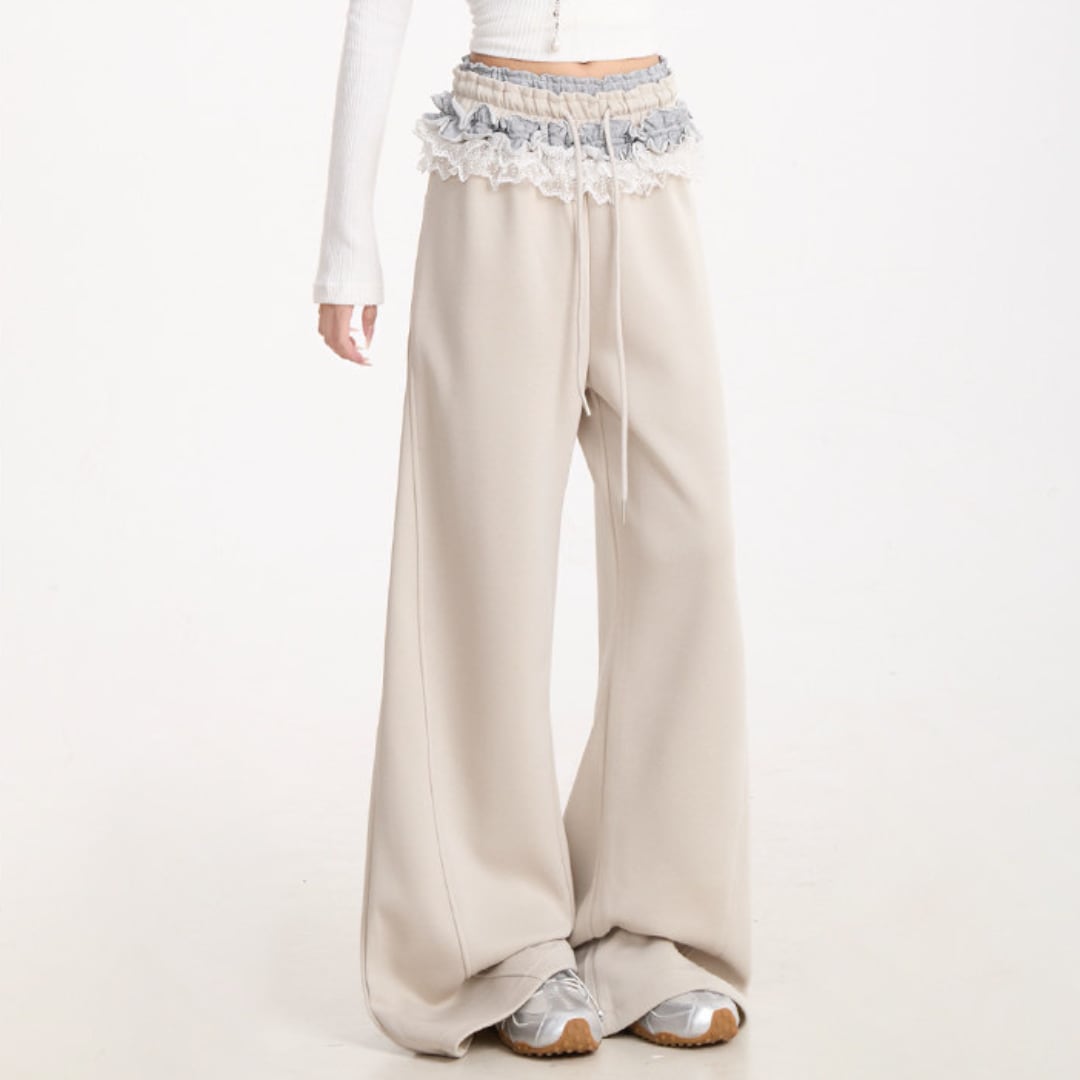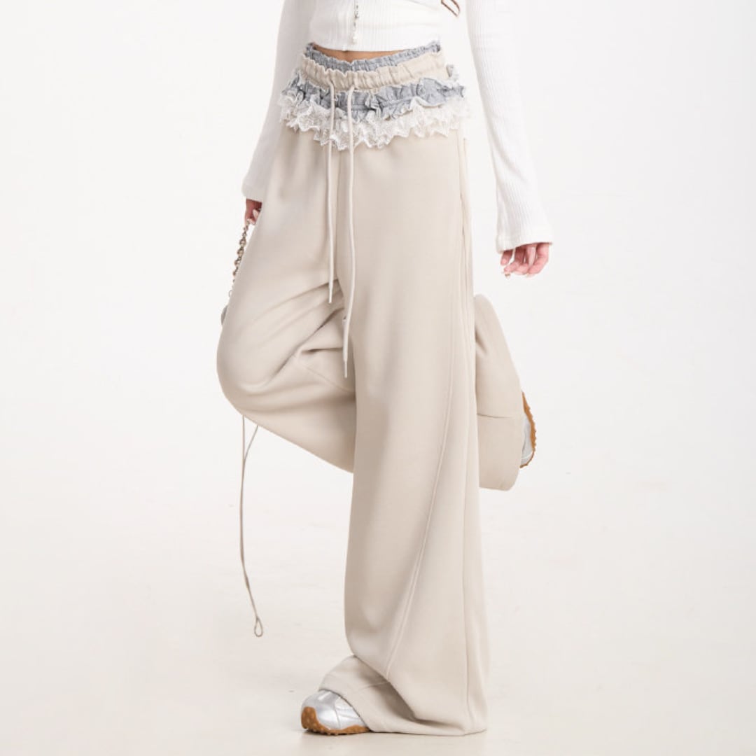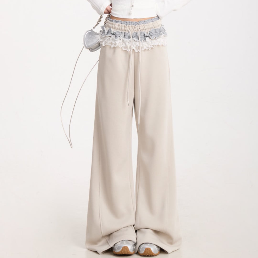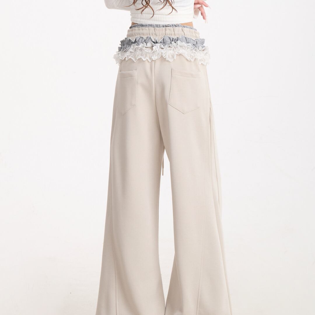 ウエストにあしらわれたレースディテールが印象的なワイドパンツ。