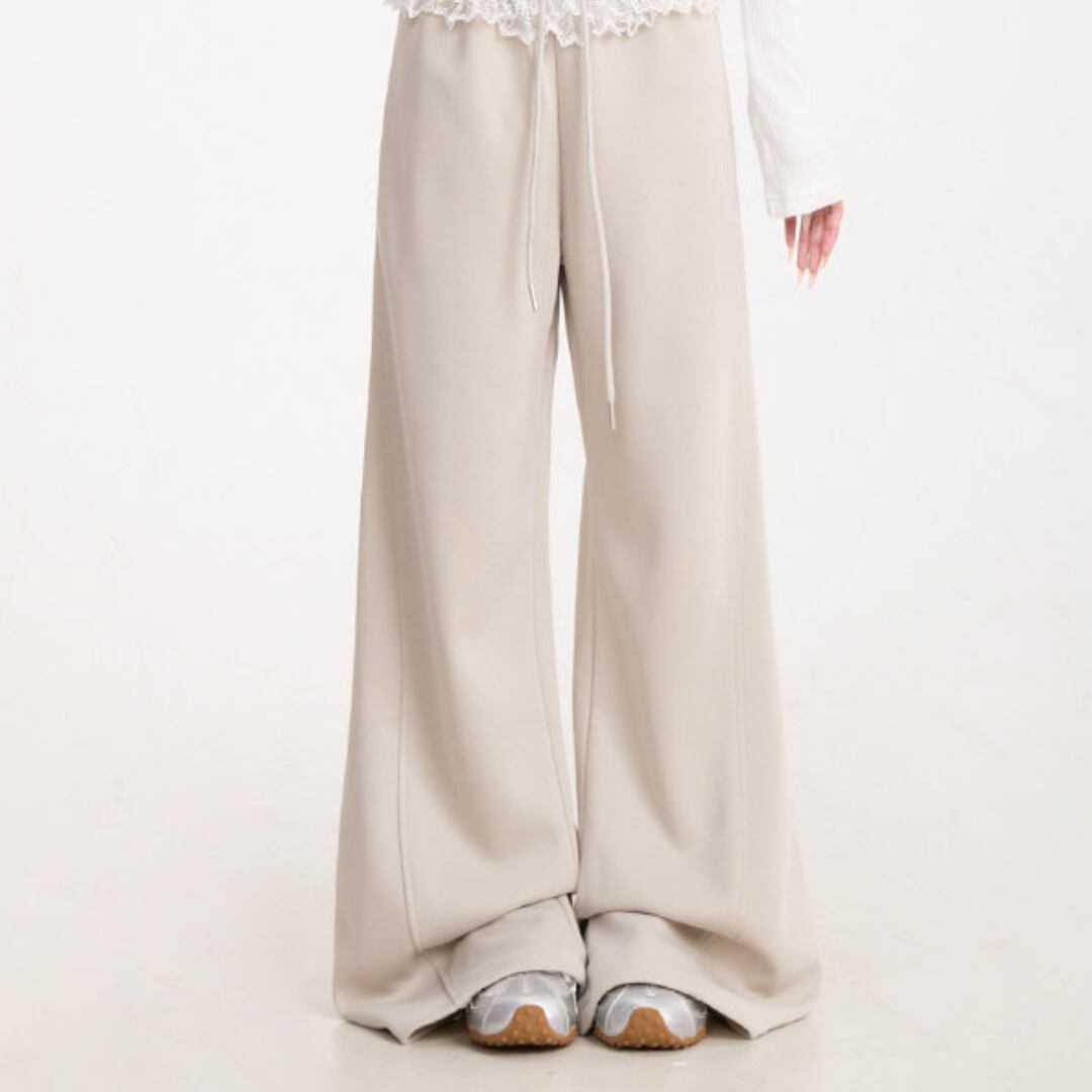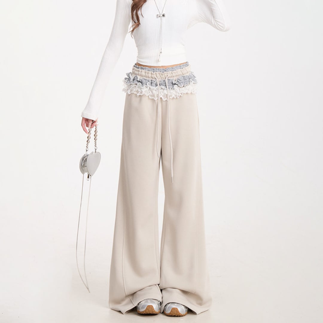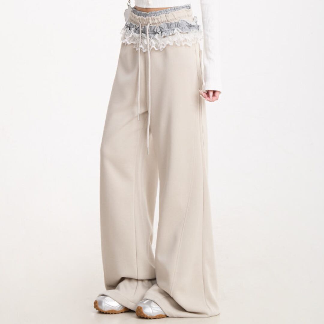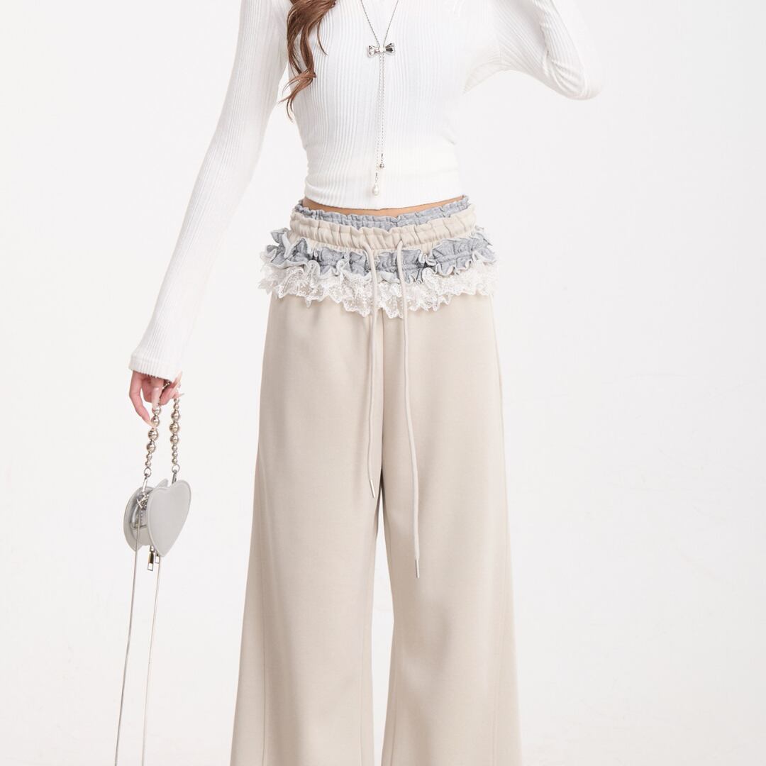 ウエストにあしらわれたレースディテールが印象的なワイドパンツ。