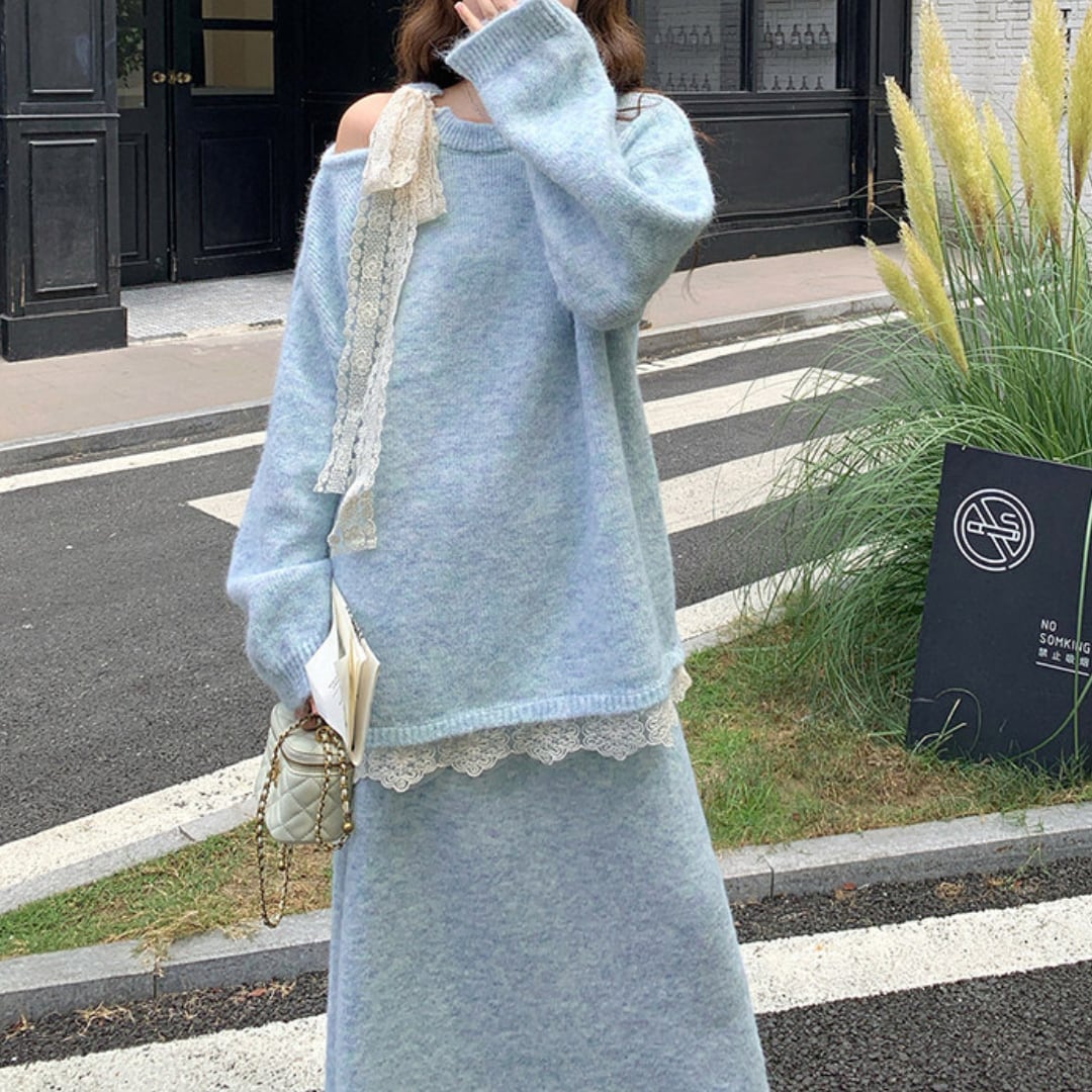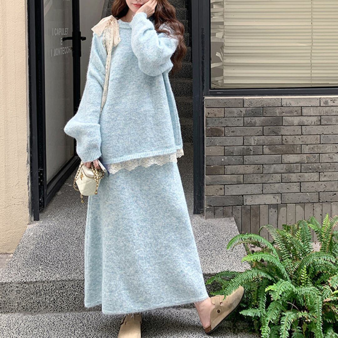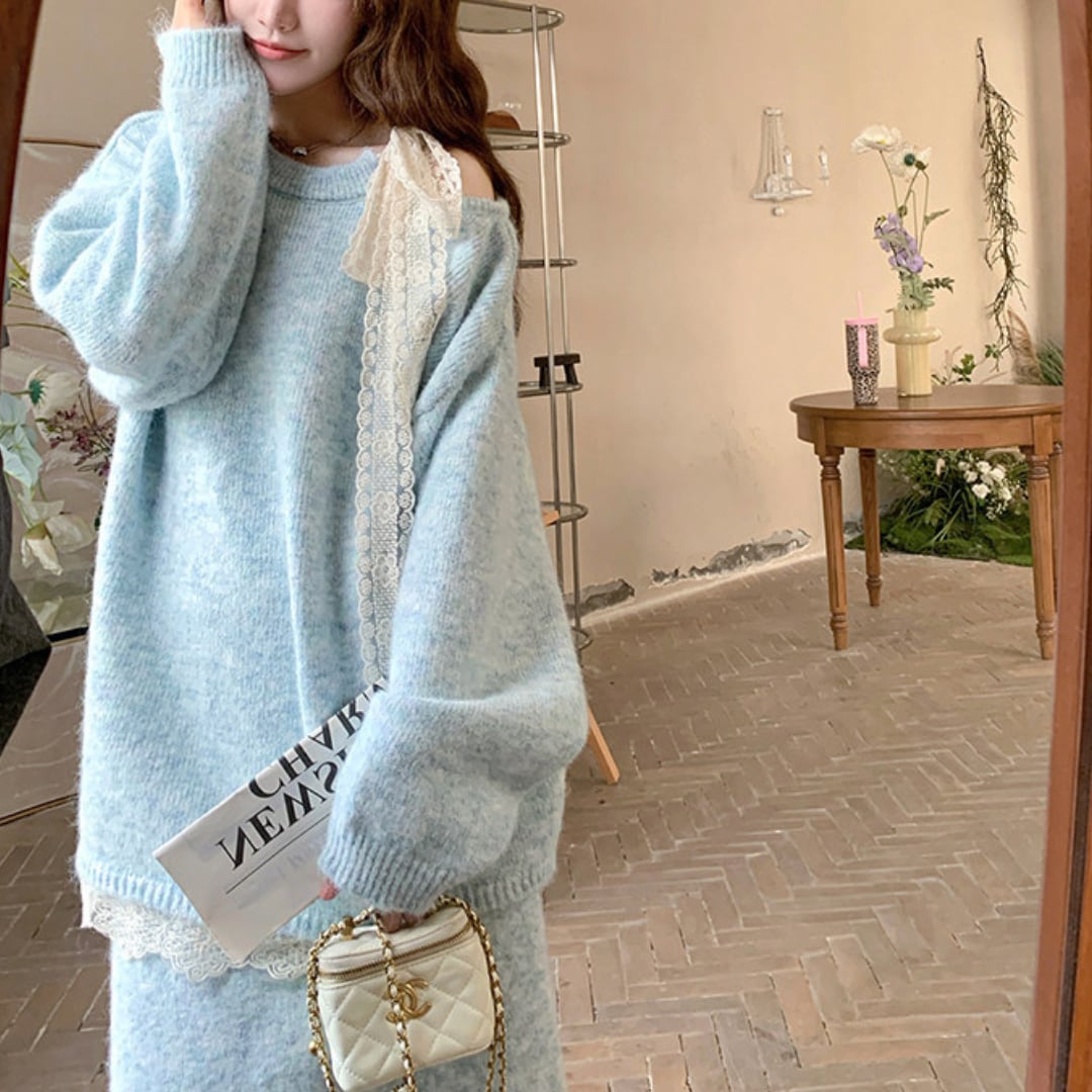 やわらかなニットと繊細なレースのレイヤードが美しく調和した、上品な印象のセットアップ。優しい雰囲気をまといながら、落ち着いた大人の女性らしさを引き立てる一着です。