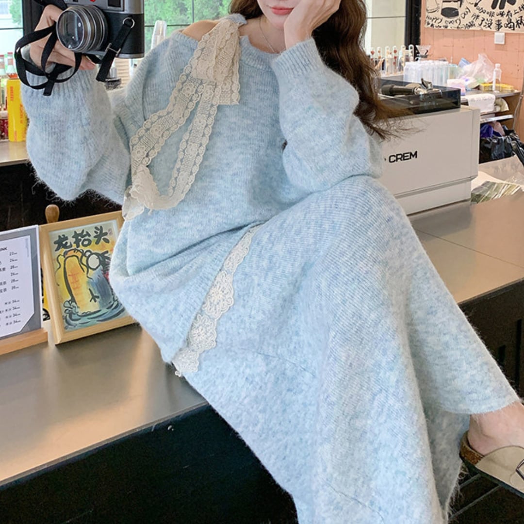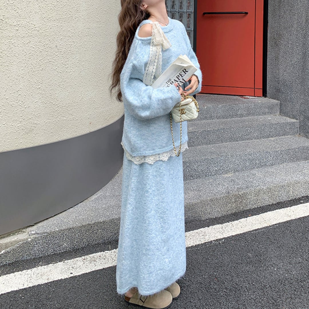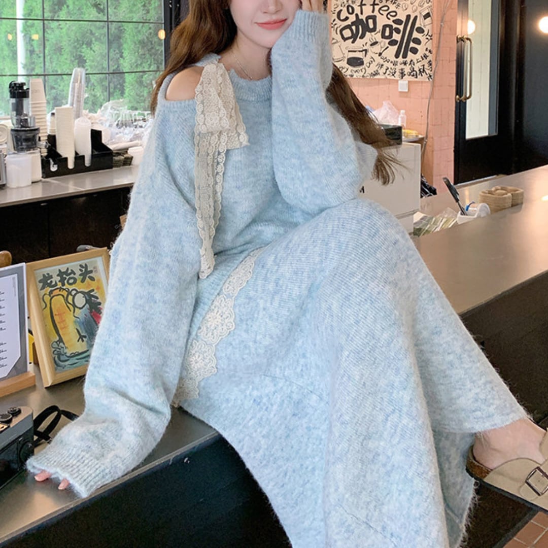 やわらかなニットと繊細なレースのレイヤードが美しく調和した、上品な印象のセットアップ。優しい雰囲気をまといながら、落ち着いた大人の女性らしさを引き立てる一着です。