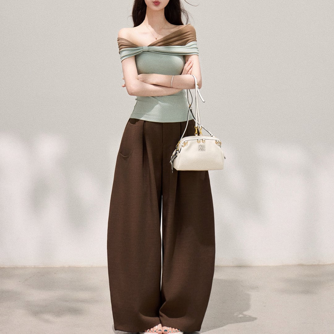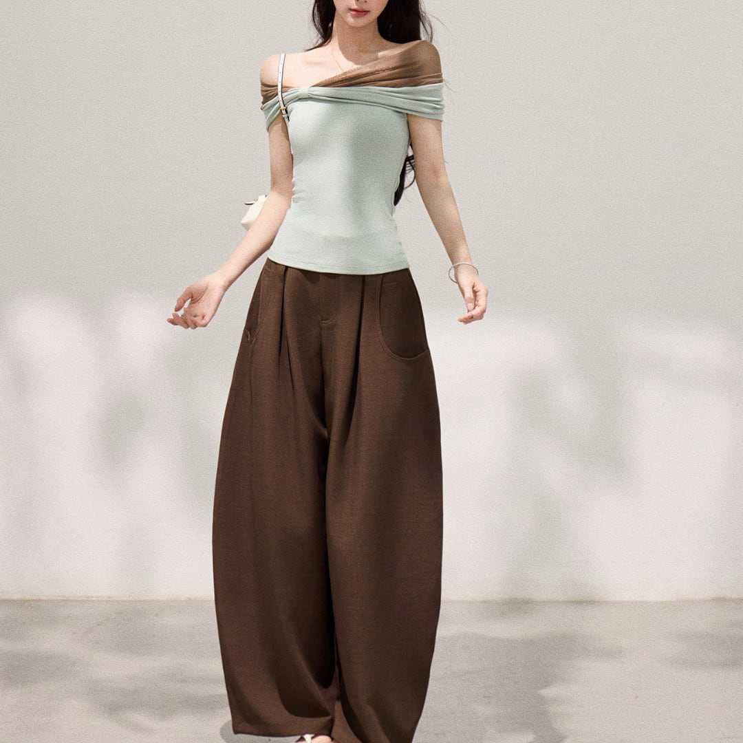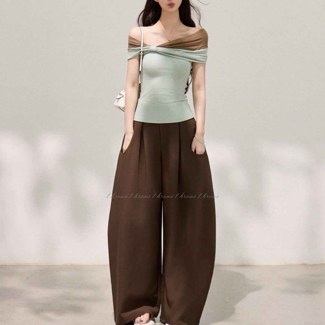 デコルテを美しく引き立てる、洗練されたオフショルダートップス。柔らかな配色とシンプルな中に映えるディテールが、大人の余裕を感じさせる一着です。