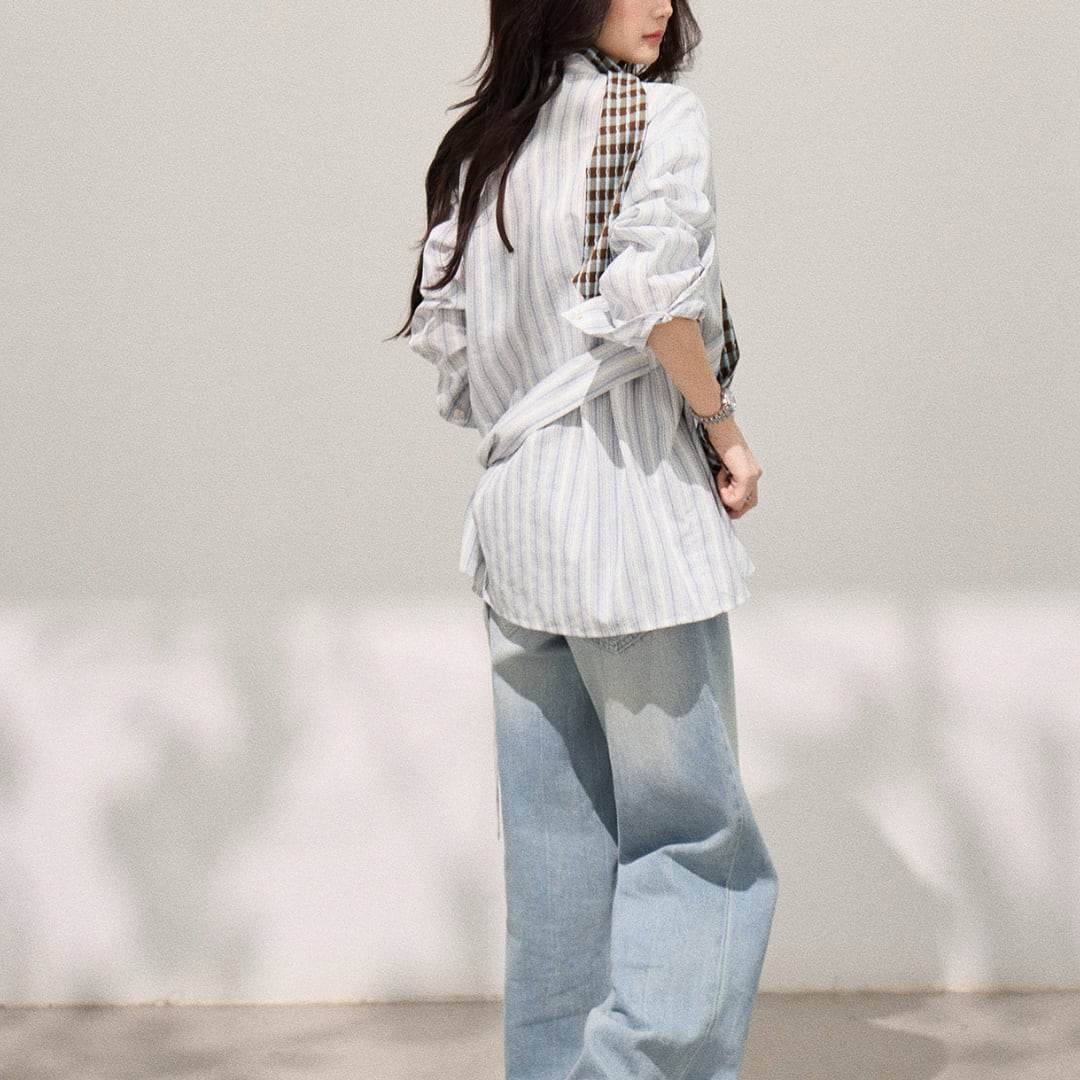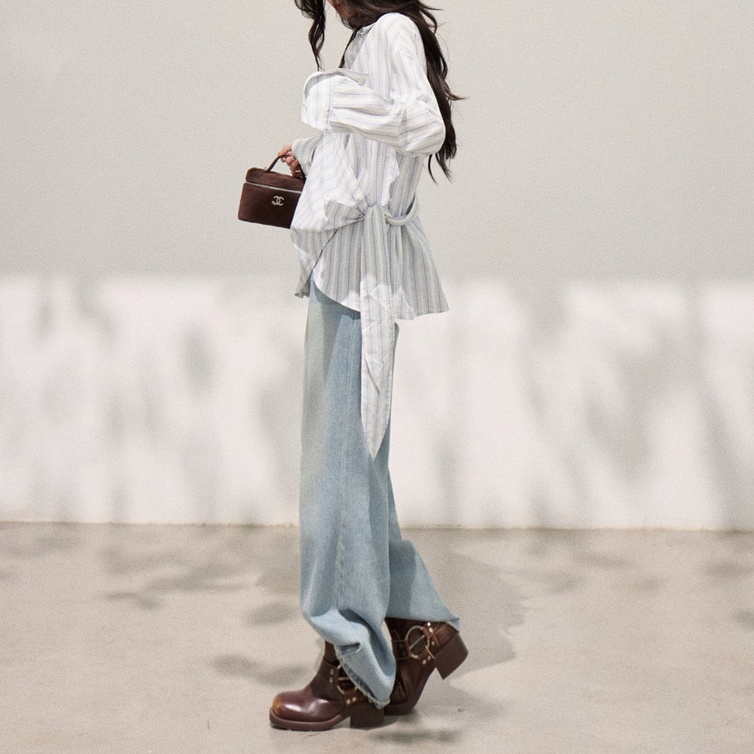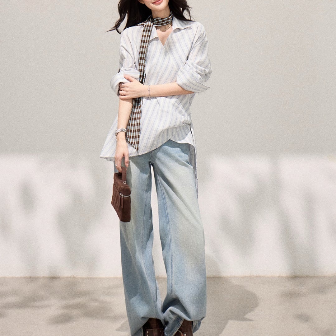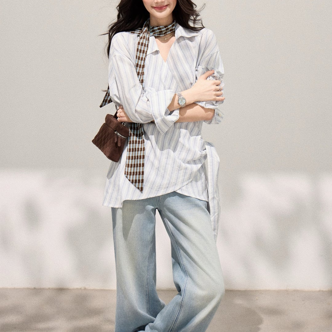 軽やかなストライプが印象的な、ラップデザインのロングシャツ。程よい抜け感と洗練された雰囲気を兼ね備えた、大人のための一着です。