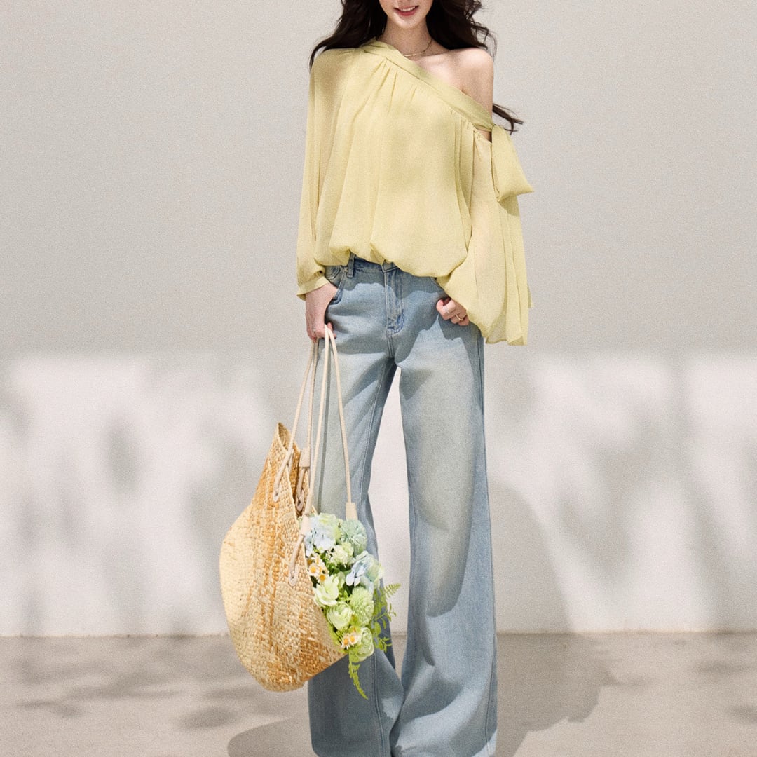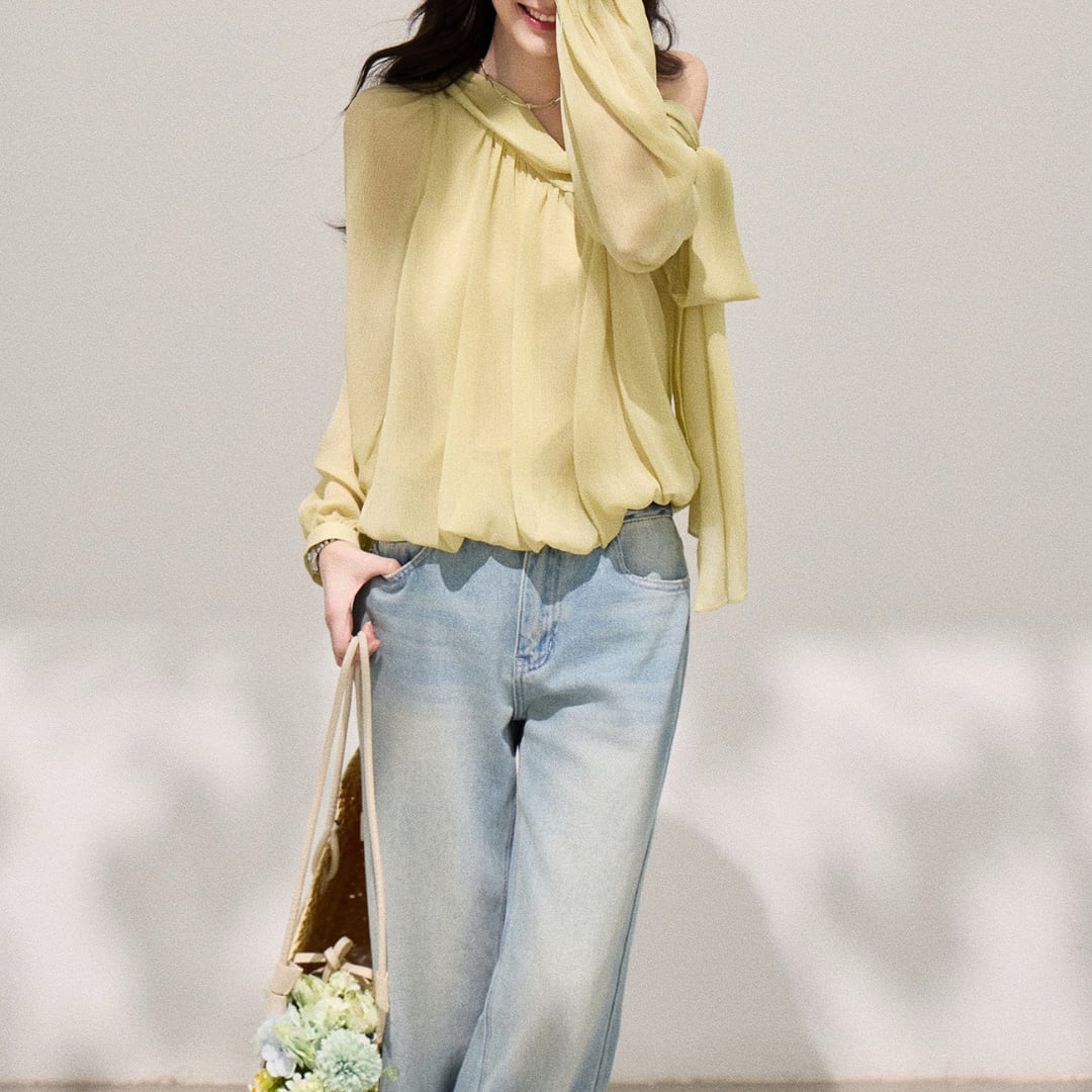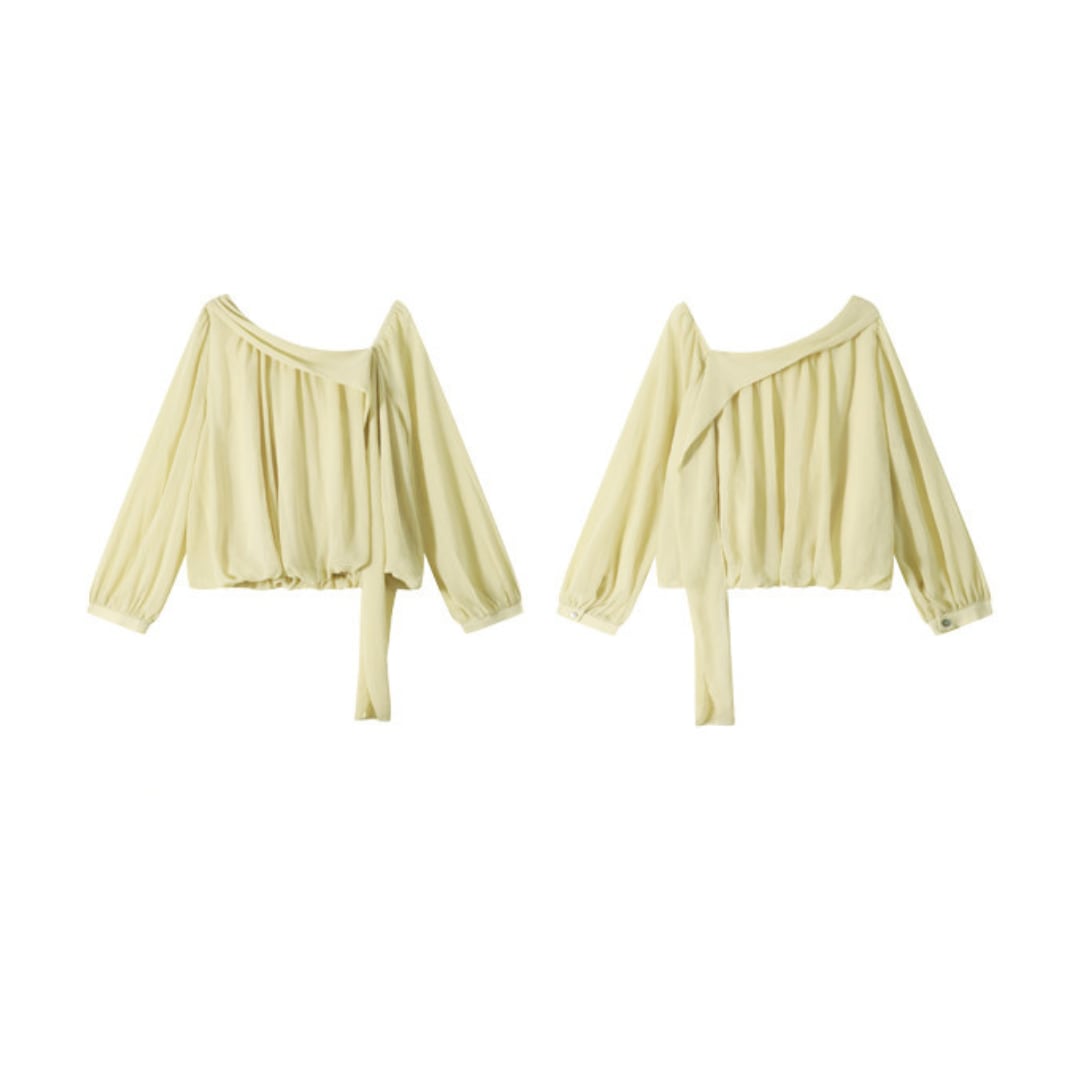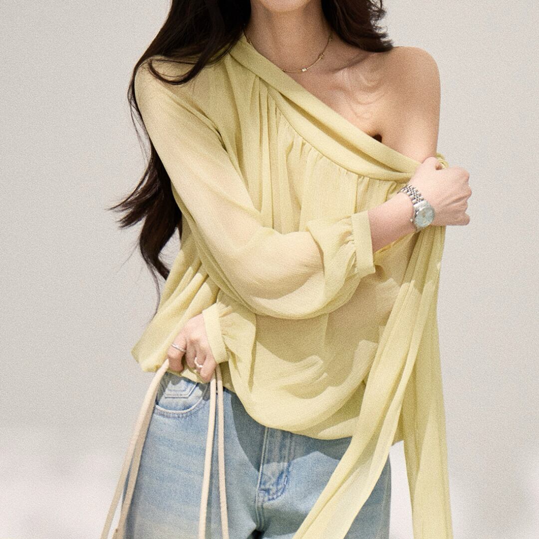 軽やかな素材感と柔らかな色合いが印象的な、アシンメトリーデザインのブラウス。優雅な雰囲気を纏い、大人の女性らしさを引き立てる一着です。