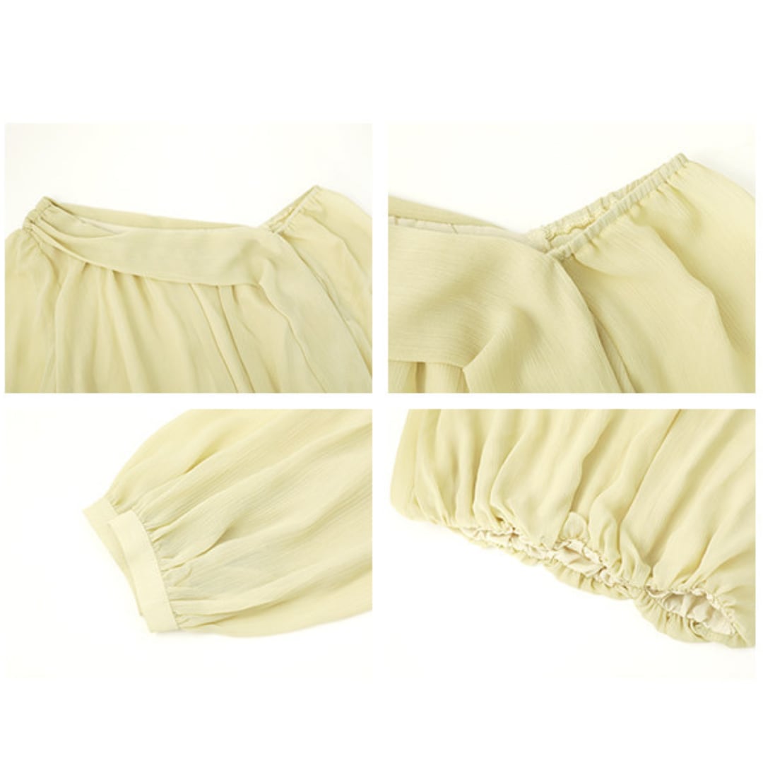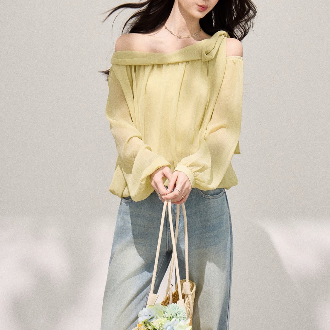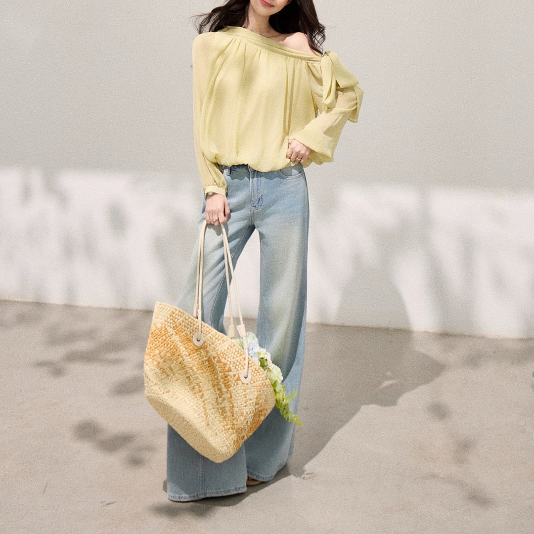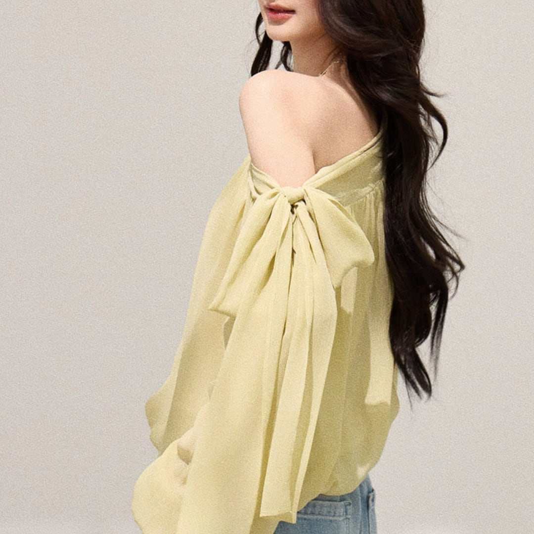 斜めに流れるネックラインとリボンディテールが、デコルテを美しく見せながら洗練された印象を演出。ふんわりとしたスリーブと程よいゆとりのあるシルエットが、動きのある柔らかな表情を生み出します。