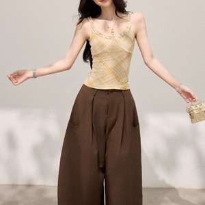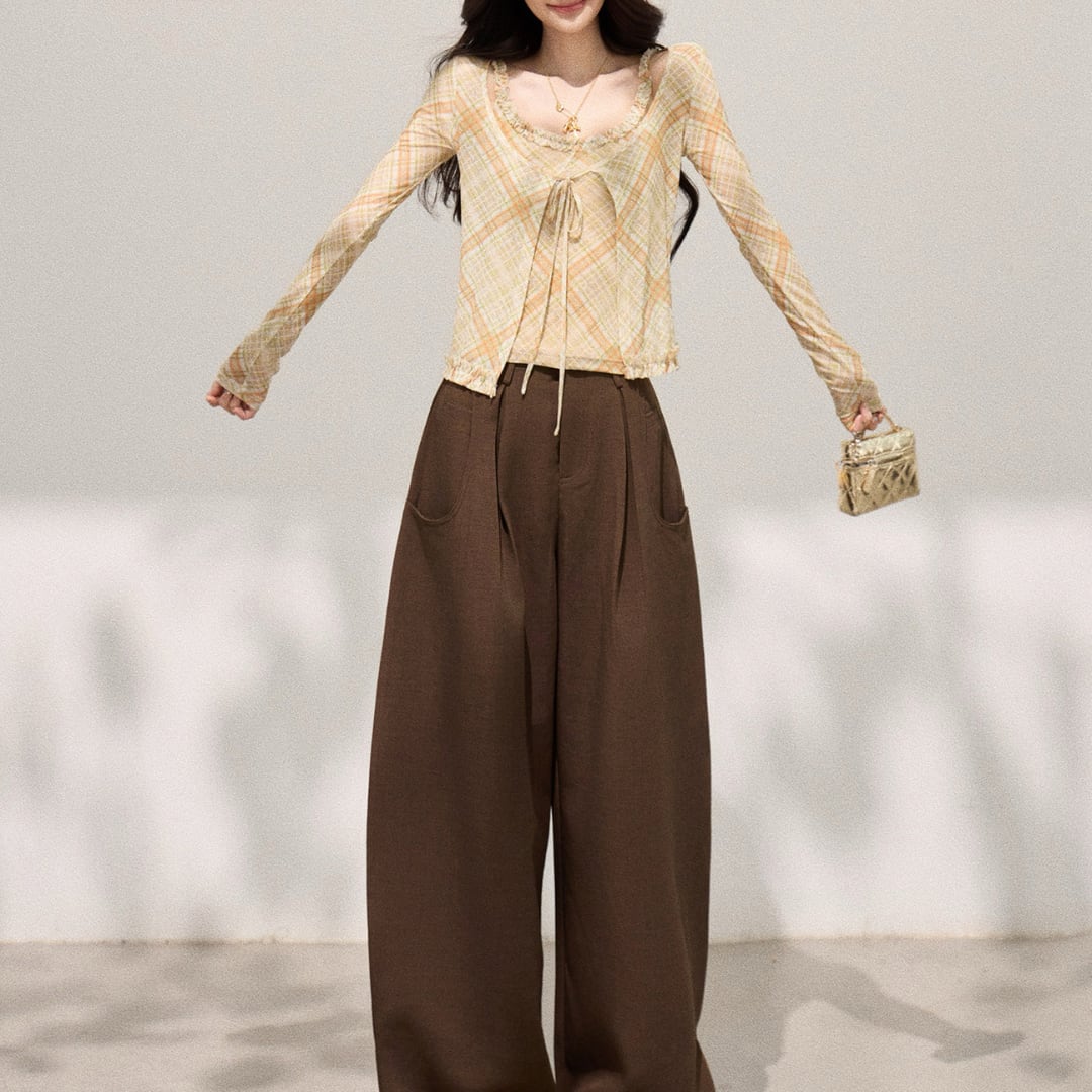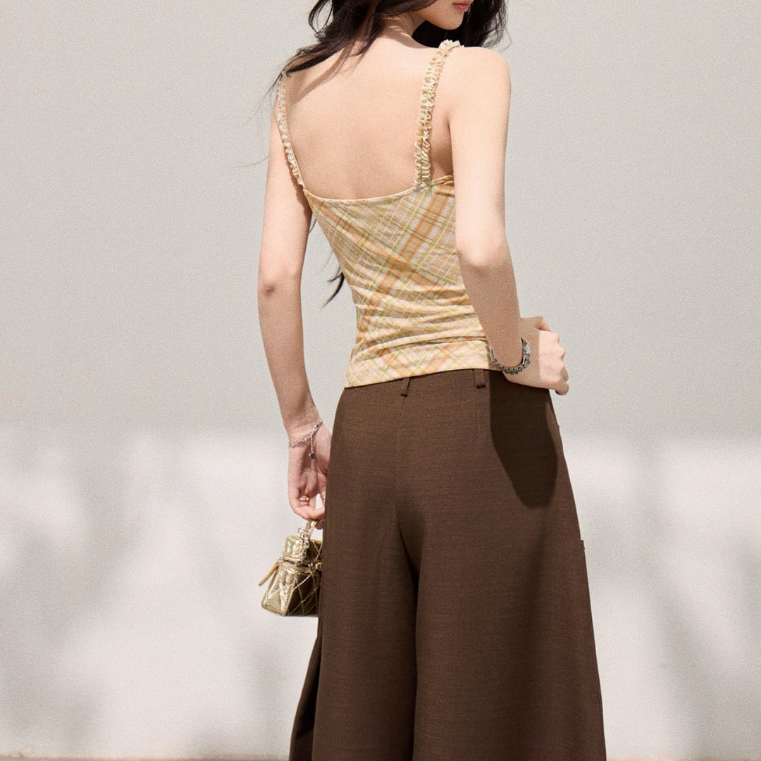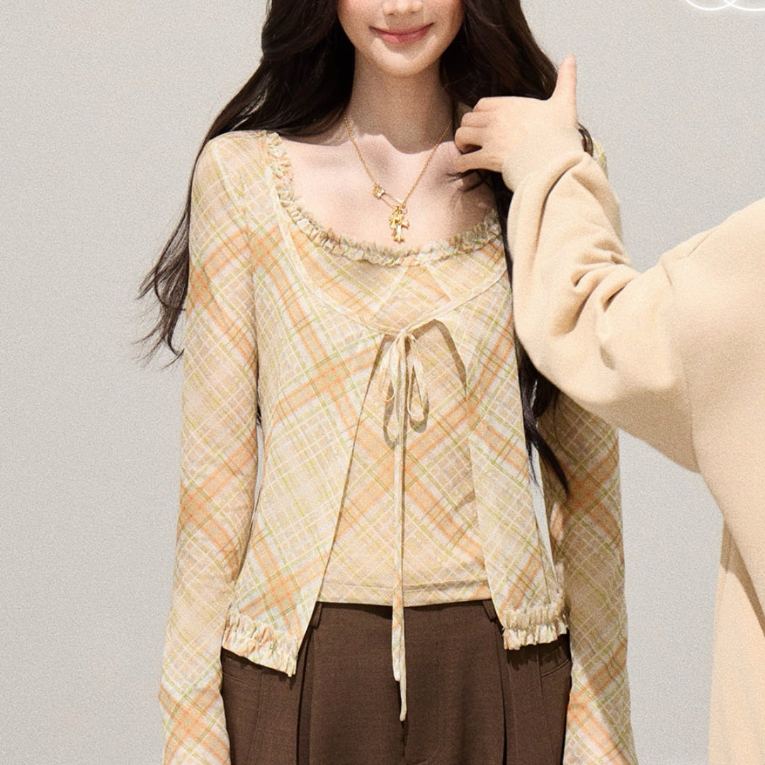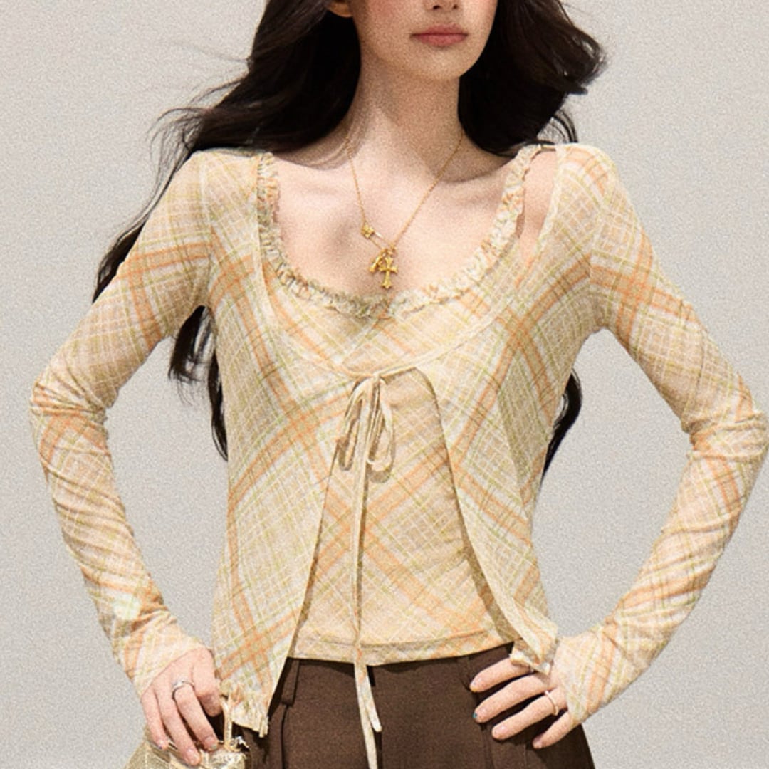 繊細なチェック柄がやわらかな印象を演出する、キャミソールとカーディガンのアンサンブル。