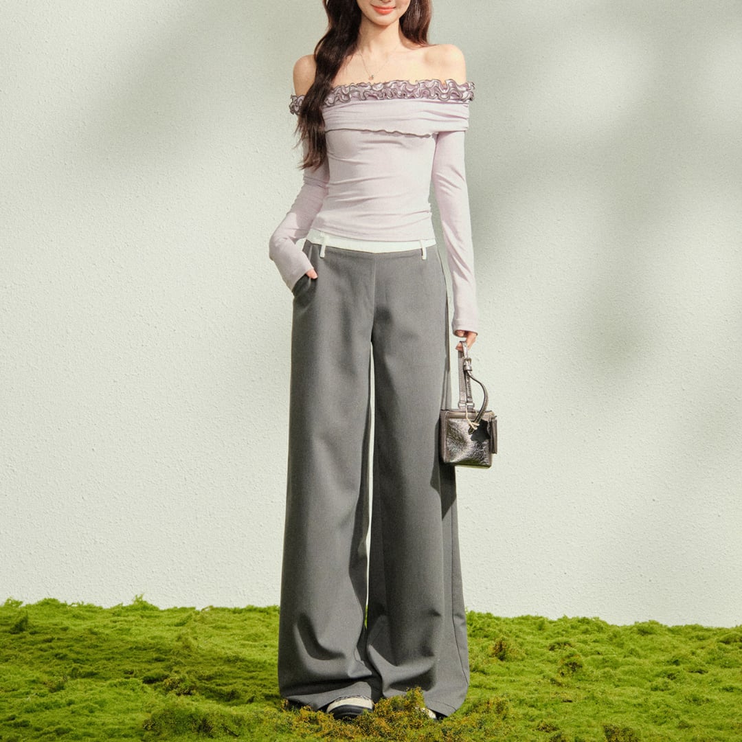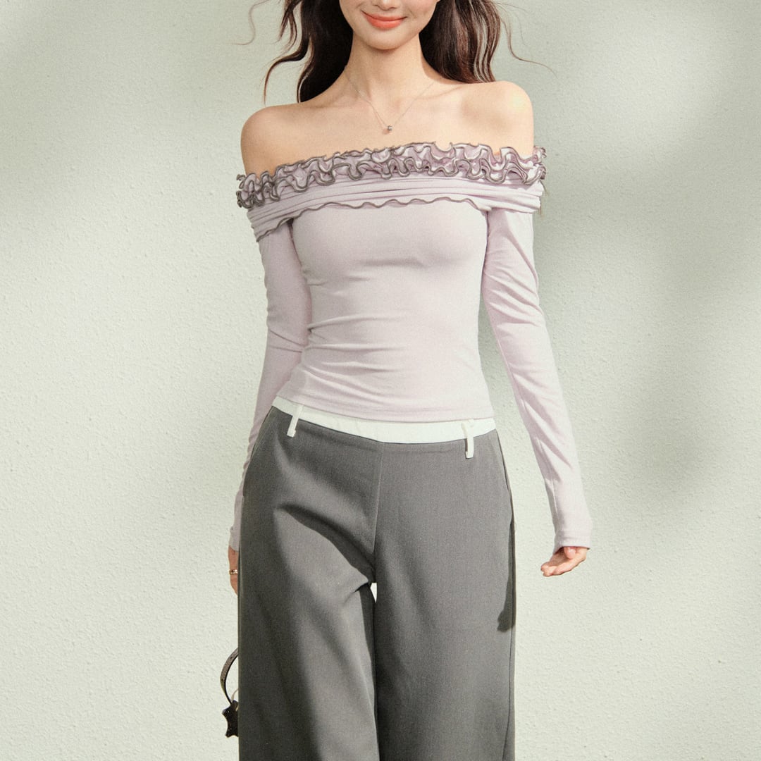 デコルテを美しく引き立てる、オフショルダーデザインのロングスリーブトップス。