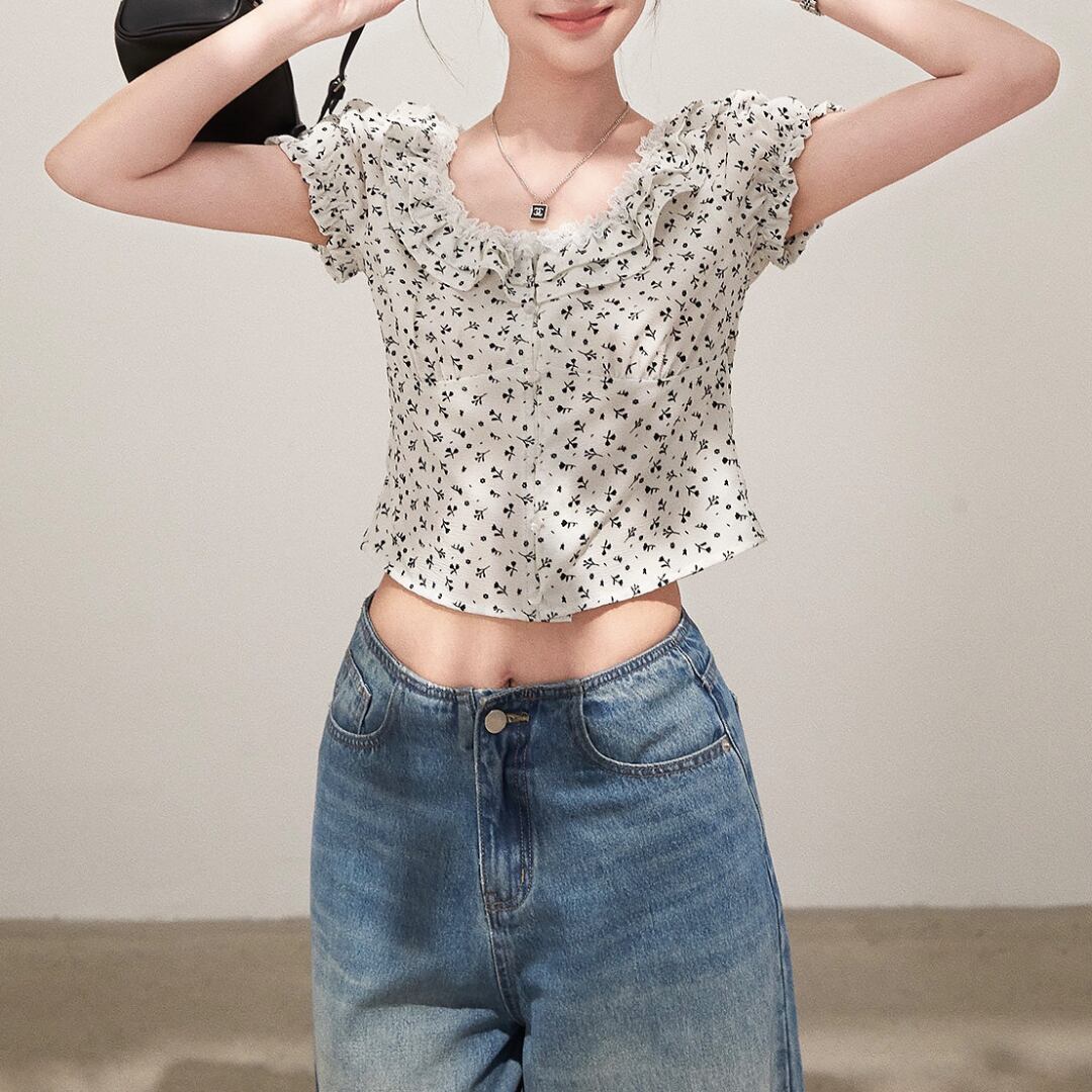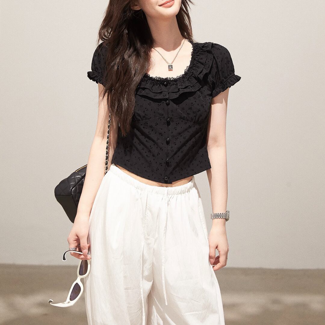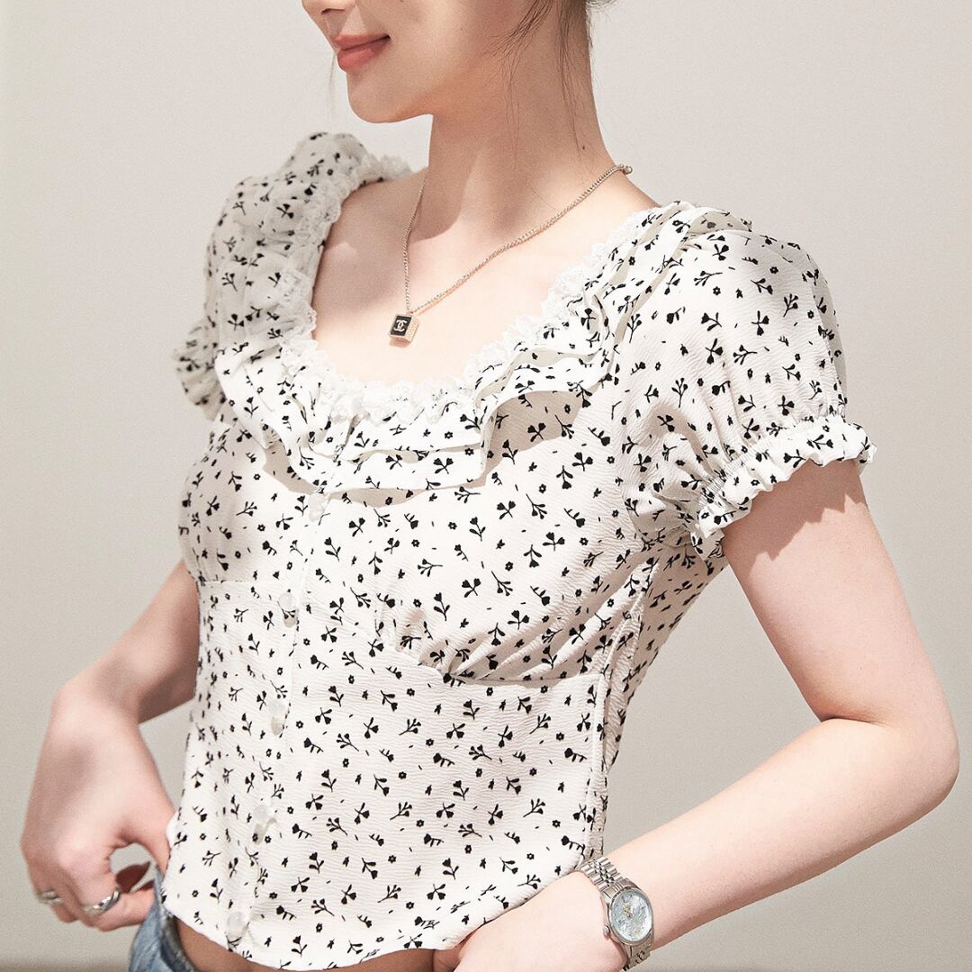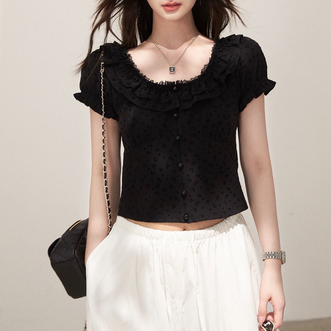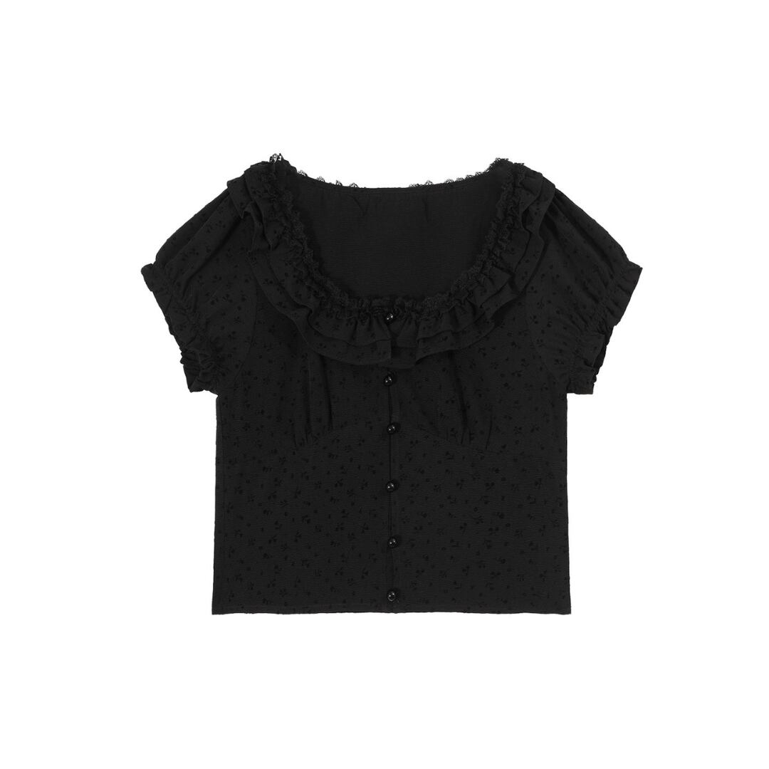 ■商品説明 繊細なフリルディテールが印象的な、女性らしさを引き立てるコンパクトトップス。さりげない華やかさを添え、上品なスタイルを完成させます。 柔らかなUネックラインに沿うフリルが、デコルテを美しく演出。コンパクトなシルエットとフロントボタンが、クラシックで洗練された印象を与えます。 身体に程よくフィットするラインと短めの丈感が、ウエスト位置を高く見せスタイルアップを実現。すっきりとしたバランスで女性らしいシルエットを引き立てます。 デイリーからお出かけまで幅広く活躍し、シンプルなボトムと合わせるだけで上品な装いに。軽やかで洗練された大人の一着です。 ■素材 表地:その他100% 裏地:なし ■カラー ブラック ホワイト ■サイズ S:着丈44cm / 肩幅36cm / 胸囲86cm / 袖丈17cm M:着丈45cm / 肩幅37cm / 胸囲90cm / 袖丈17.5cm L:着丈46cm / 肩幅38cm / 胸囲94cm / 袖丈18cm ※平置き採寸のため 1〜3cm の誤差があります。 ーーーーーーーーーーーーーーーーーーーーーーーーーーー 【注意事項】 ▪当店ではお求めやすい価格で提供することを心がけ、経費削減として海外倉庫を利用しています。 そのため、お取り寄せ商品は14〜30営業日前後いただく場合がございます。 ▪︎送料は北海道・沖縄・離島以外1000円、北海道・沖縄・離島は1500円頂戴しております。 ▪︎お買い上げ10,000円以上の場合、送料は無料です。 ▪︎こちらは海外製造の商品です。日本基準ではございませんので、作りがあまい場合がございます。 ▪︎お手持ちのPCやスマートフォンの画面により商品の色に若干の差がございます。 ▪︎イメージの違いやサイズ交換等、お客様の都合による交換、返品の対応はできかねます。 詳細は『ご購入前に必ずお読みください』を確認のうえご購入をお願いします。 https://www.amoratokyo.jp/blog/2023/11/01/011701