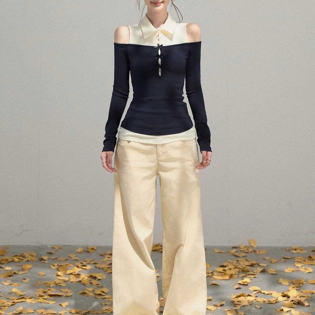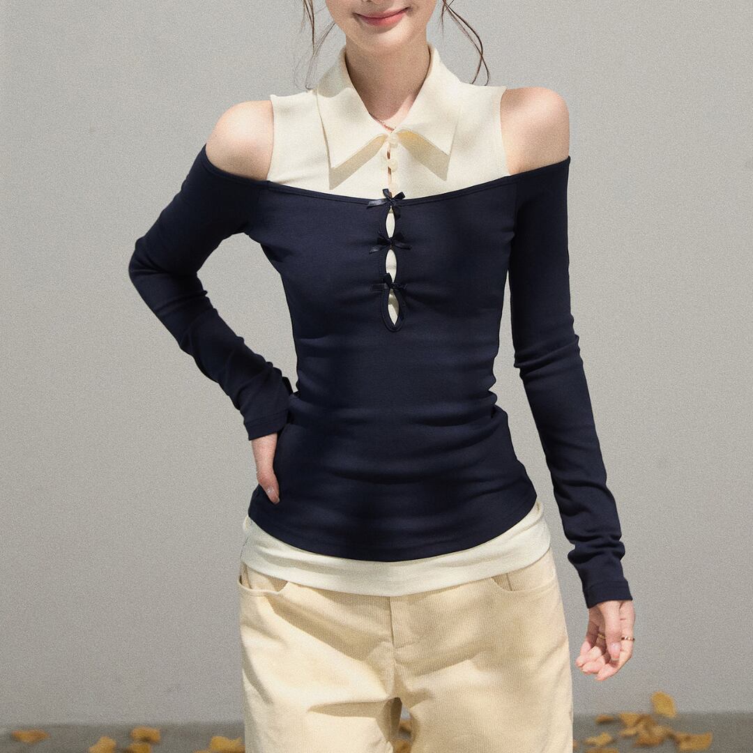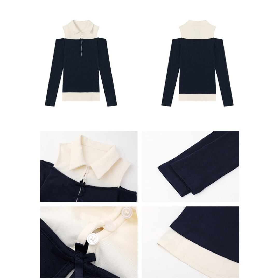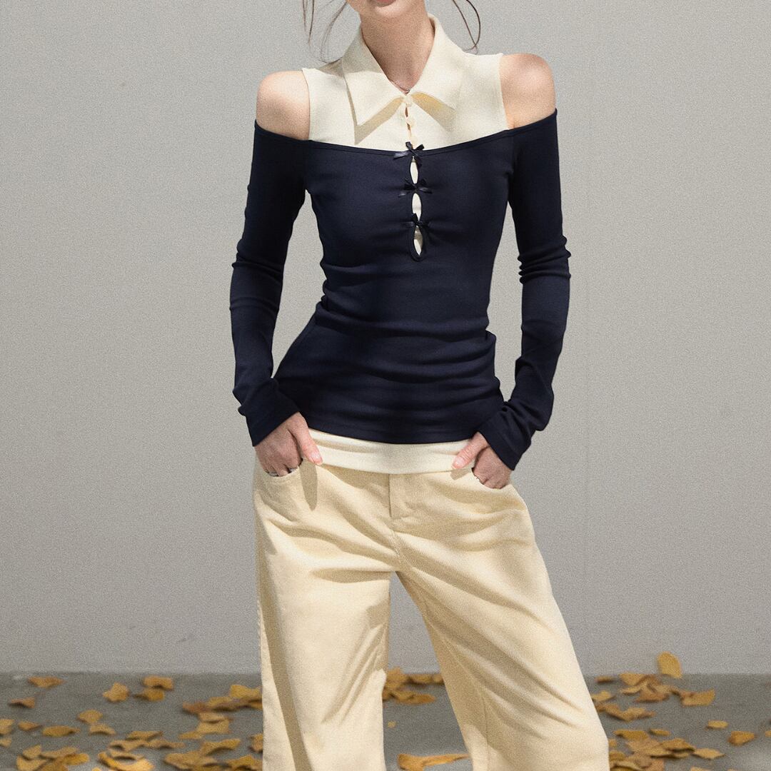 シャープな襟元とデコルテを美しく見せるオフショルダーの組み合わせが、上品な女性らしさを演出。フロントのリボンディテールが、さりげないアクセントとして華やぎを添えます。