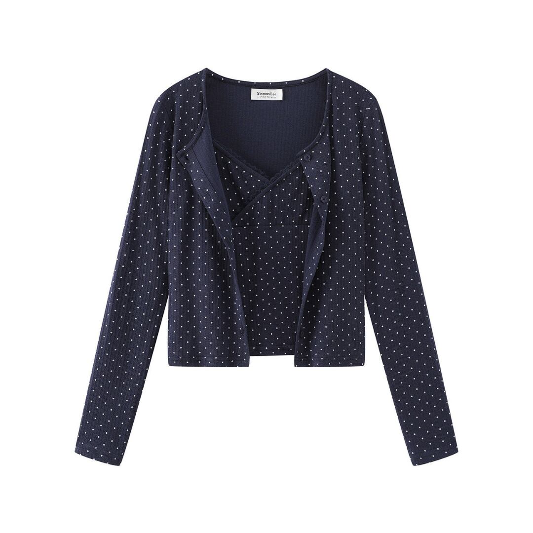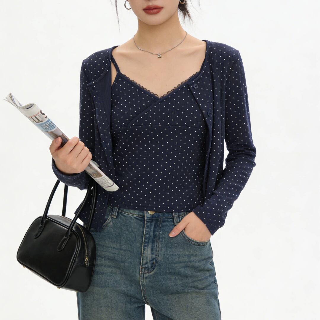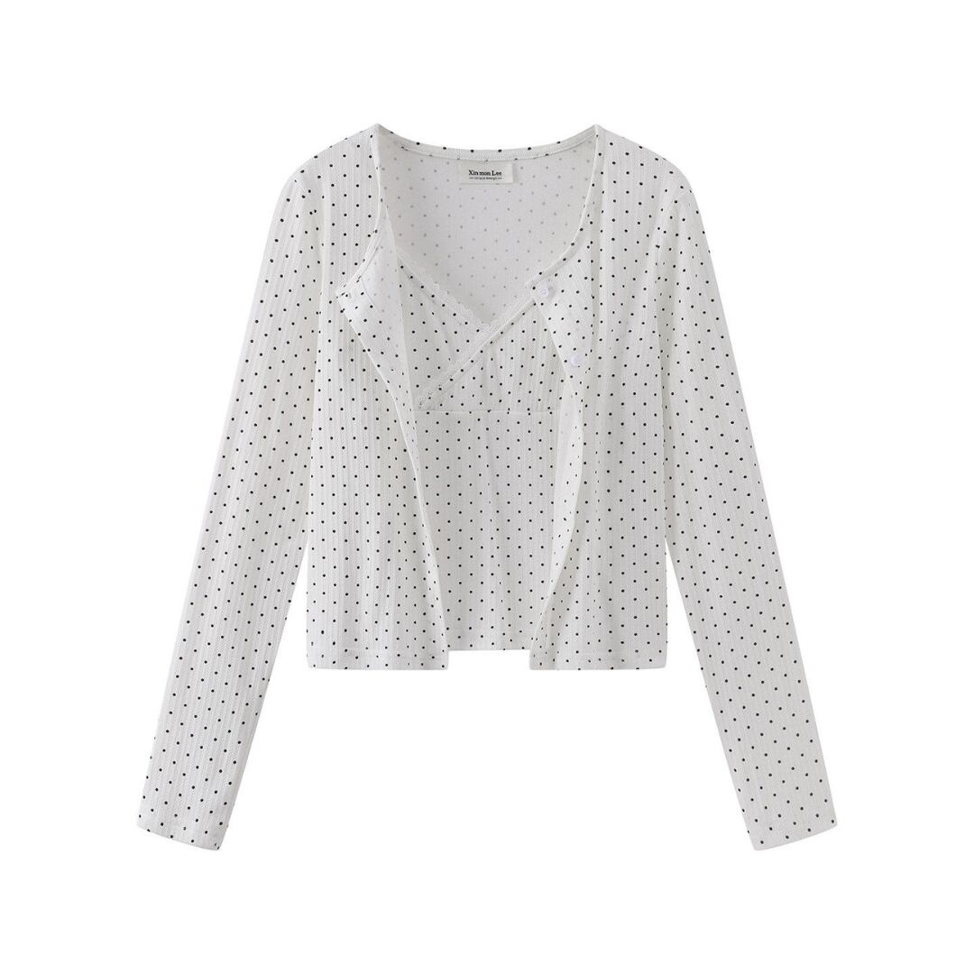 ■商品説明 繊細なドット柄が印象的な、キャミソールとカーディガンの2点セットトップス。軽やかで統一感のあるレイヤードスタイルが完成します。 フロントを重ねたカシュクール風のキャミソールと、コンパクトなカーディガンが女性らしいバランスを演出。さりげないレースディテールが上品なアクセントを添えます。 身体に程よく沿うシルエットと短めの丈感が、ウエスト位置を高く見せスタイルアップを実現。重ねてもすっきりとした印象で、自然に体型を整えます。 デイリーからカフェスタイルまで幅広く活躍し、それぞれ単品でも着回し可能。洗練された大人のカジュアルスタイルを叶える一着です。 ■素材 表地:その他 裏地:なし ■カラー ネイビー ホワイト ■サイズ 【トップス】 S:着丈45cm / 肩幅34cm / 胸囲72cm / 袖丈58cm M:着丈46cm / 肩幅35cm / 胸囲74cm / 袖丈59cm 【インナー】 S:着丈25cm / 胸囲68cm M:着丈26cm / 胸囲70cm ※平置き採寸のため 1〜3cm の誤差があります。 ーーーーーーーーーーーーーーーーーーーーーーーーーーー 【注意事項】 ▪当店ではお求めやすい価格で提供することを心がけ、経費削減として海外倉庫を利用しています。 そのため、お取り寄せ商品は14〜30営業日前後いただく場合がございます。 ▪︎送料は北海道・沖縄・離島以外1000円、北海道・沖縄・離島は1500円頂戴しております。 ▪︎お買い上げ10,000円以上の場合、送料は無料です。 ▪︎こちらは海外製造の商品です。日本基準ではございませんので、作りがあまい場合がございます。 ▪︎お手持ちのPCやスマートフォンの画面により商品の色に若干の差がございます。 ▪︎イメージの違いやサイズ交換等、お客様の都合による交換、返品の対応はできかねます。 詳細は『ご購入前に必ずお読みください』を確認のうえご購入をお願いします。 https://www.amoratokyo.jp/blog/2023/11/01/011701