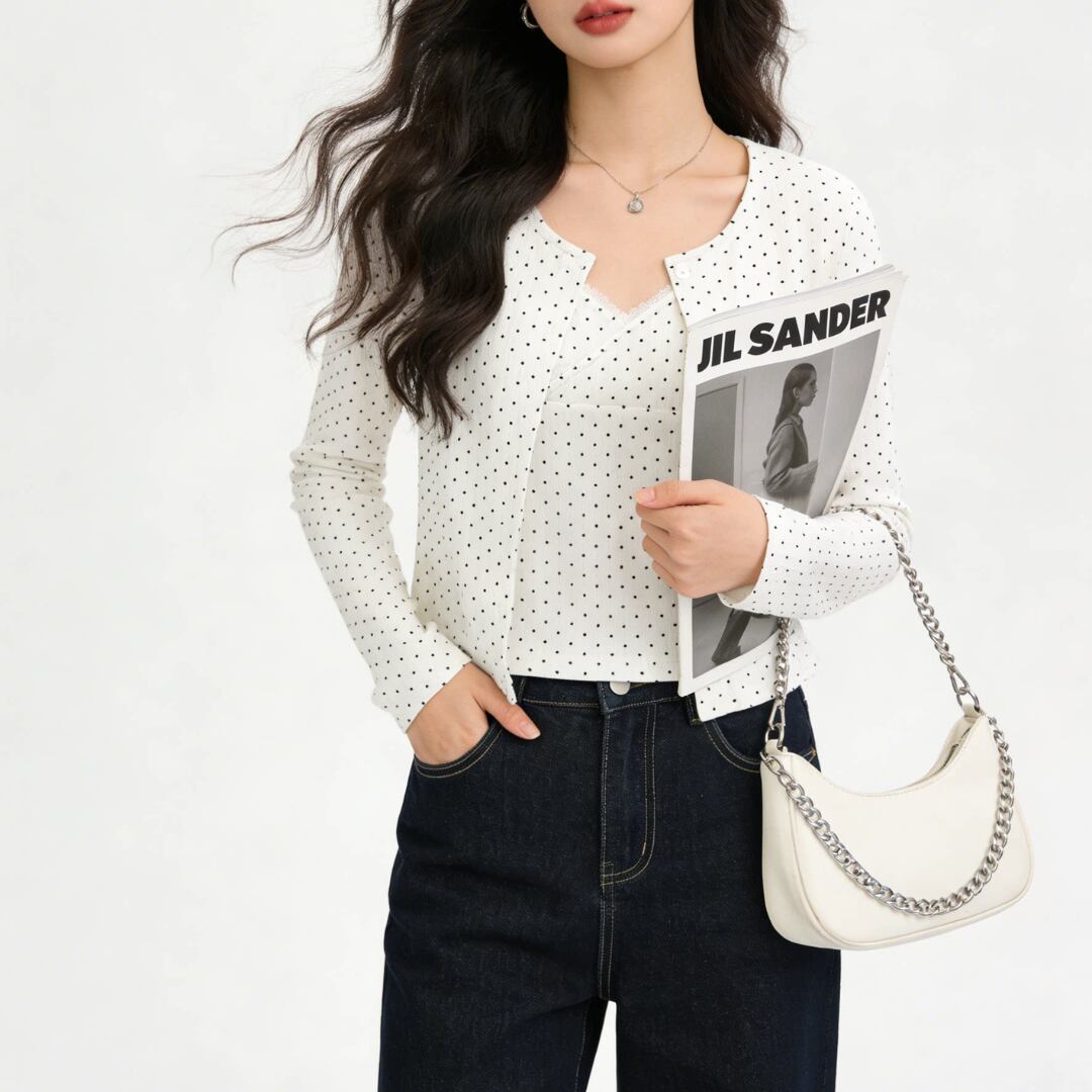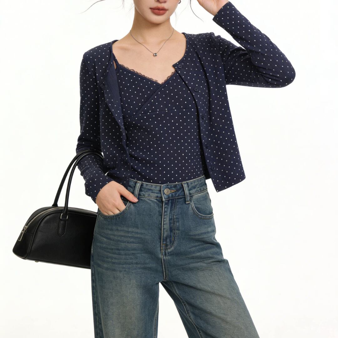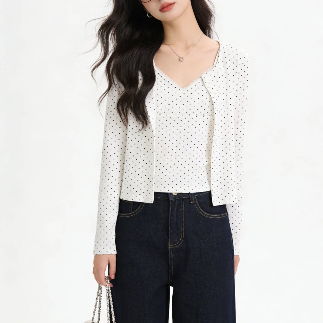 ■商品説明 繊細なドット柄が印象的な、キャミソールとカーディガンの2点セットトップス。軽やかで統一感のあるレイヤードスタイルが完成します。 フロントを重ねたカシュクール風のキャミソールと、コンパクトなカーディガンが女性らしいバランスを演出。さりげないレースディテールが上品なアクセントを添えます。 身体に程よく沿うシルエットと短めの丈感が、ウエスト位置を高く見せスタイルアップを実現。重ねてもすっきりとした印象で、自然に体型を整えます。 デイリーからカフェスタイルまで幅広く活躍し、それぞれ単品でも着回し可能。洗練された大人のカジュアルスタイルを叶える一着です。 ■素材 表地:その他 裏地:なし ■カラー ネイビー ホワイト ■サイズ 【トップス】 S:着丈45cm / 肩幅34cm / 胸囲72cm / 袖丈58cm M:着丈46cm / 肩幅35cm / 胸囲74cm / 袖丈59cm 【インナー】 S:着丈25cm / 胸囲68cm M:着丈26cm / 胸囲70cm ※平置き採寸のため 1〜3cm の誤差があります。 ーーーーーーーーーーーーーーーーーーーーーーーーーーー 【注意事項】 ▪当店ではお求めやすい価格で提供することを心がけ、経費削減として海外倉庫を利用しています。 そのため、お取り寄せ商品は14〜30営業日前後いただく場合がございます。 ▪︎送料は北海道・沖縄・離島以外1000円、北海道・沖縄・離島は1500円頂戴しております。 ▪︎お買い上げ10,000円以上の場合、送料は無料です。 ▪︎こちらは海外製造の商品です。日本基準ではございませんので、作りがあまい場合がございます。 ▪︎お手持ちのPCやスマートフォンの画面により商品の色に若干の差がございます。 ▪︎イメージの違いやサイズ交換等、お客様の都合による交換、返品の対応はできかねます。 詳細は『ご購入前に必ずお読みください』を確認のうえご購入をお願いします。 https://www.amoratokyo.jp/blog/2023/11/01/011701