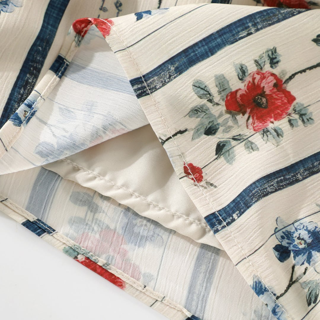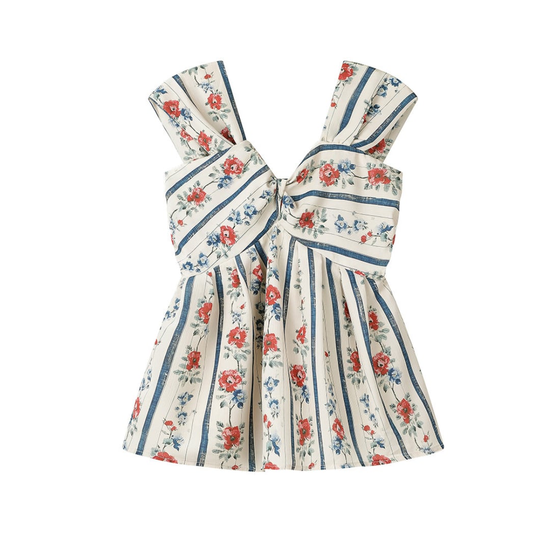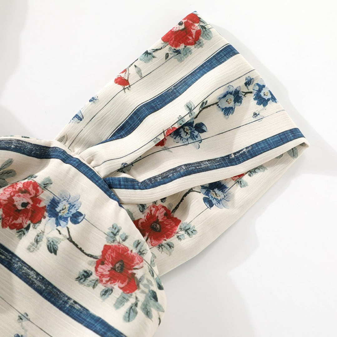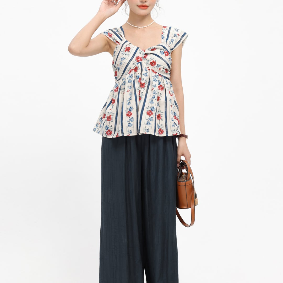 可憐なフラワープリントが印象的な、女性らしさを引き立てるペプラムトップス。柔らかな雰囲気の中に、上品な華やぎを感じさせる一着です。