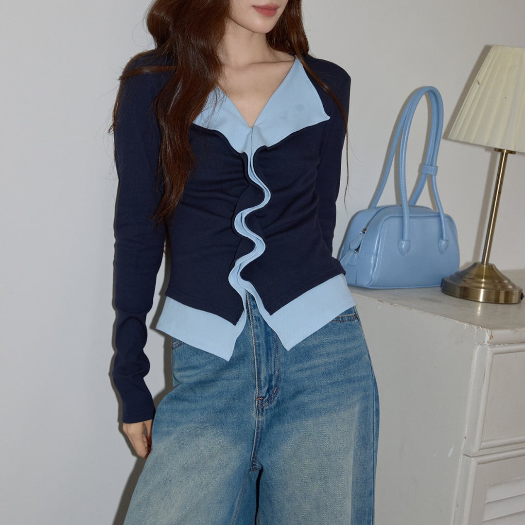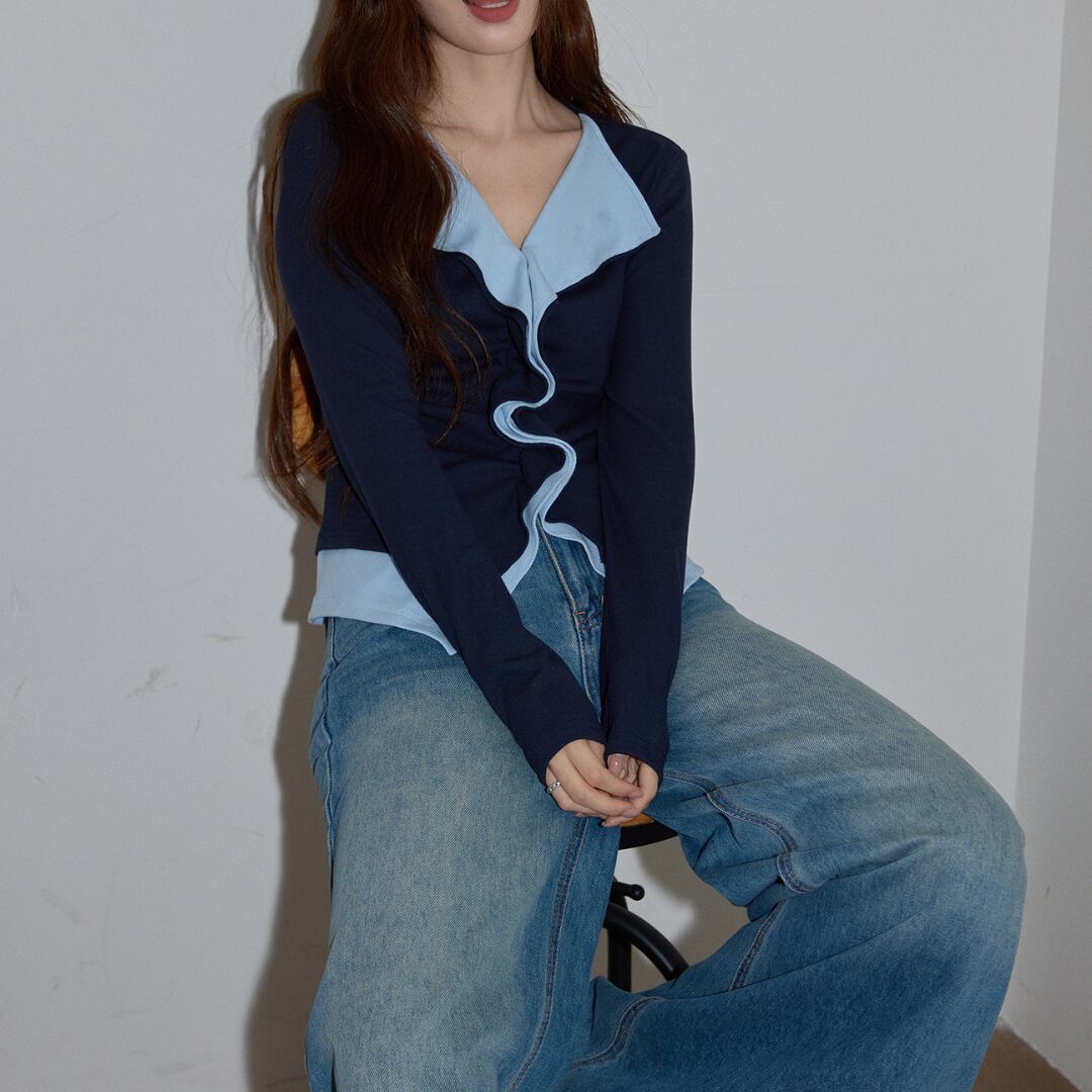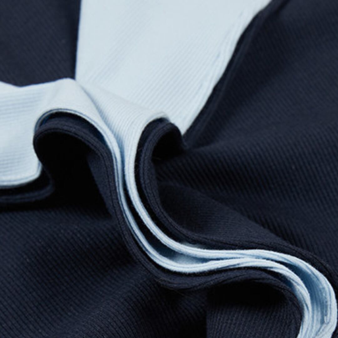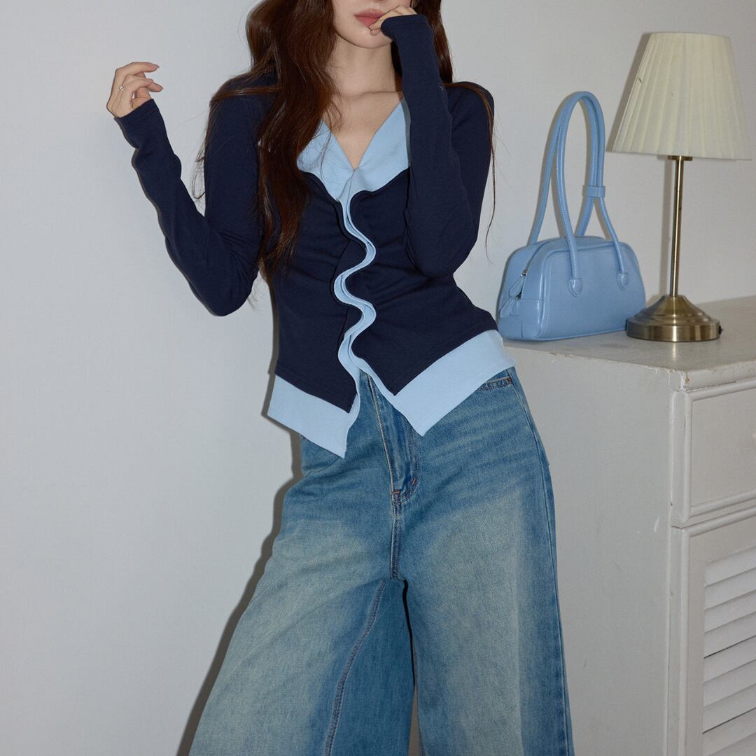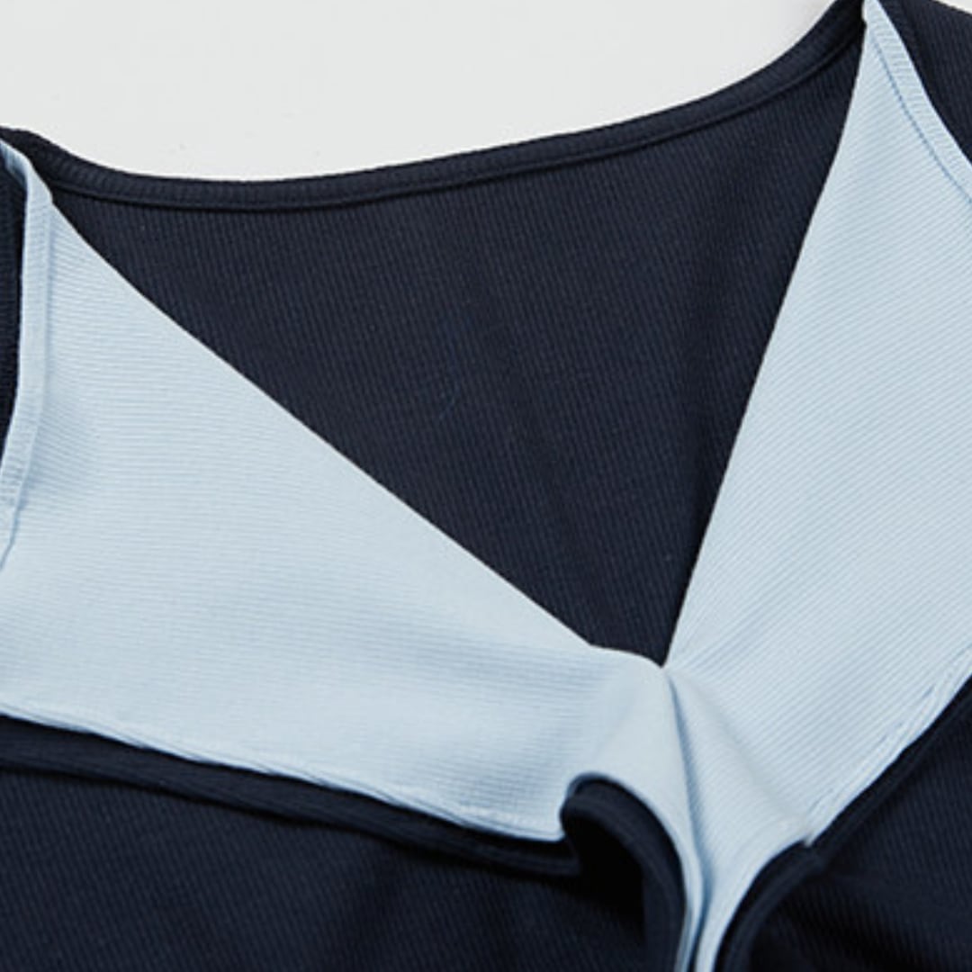 配色のコントラストが印象的な、洗練されたデザインのスリムトップス。さりげなく個性を添えながらも、上品にまとまる一着です。