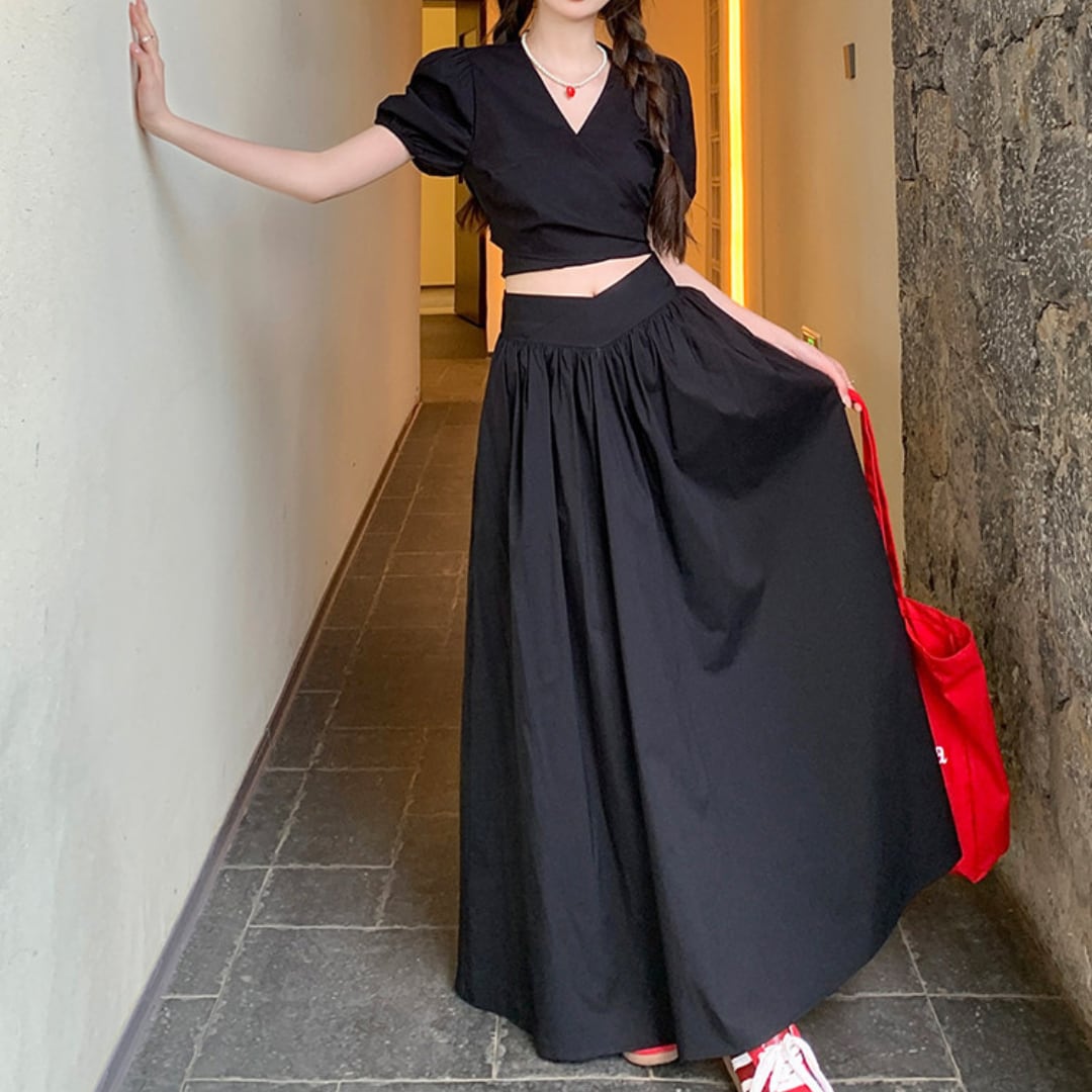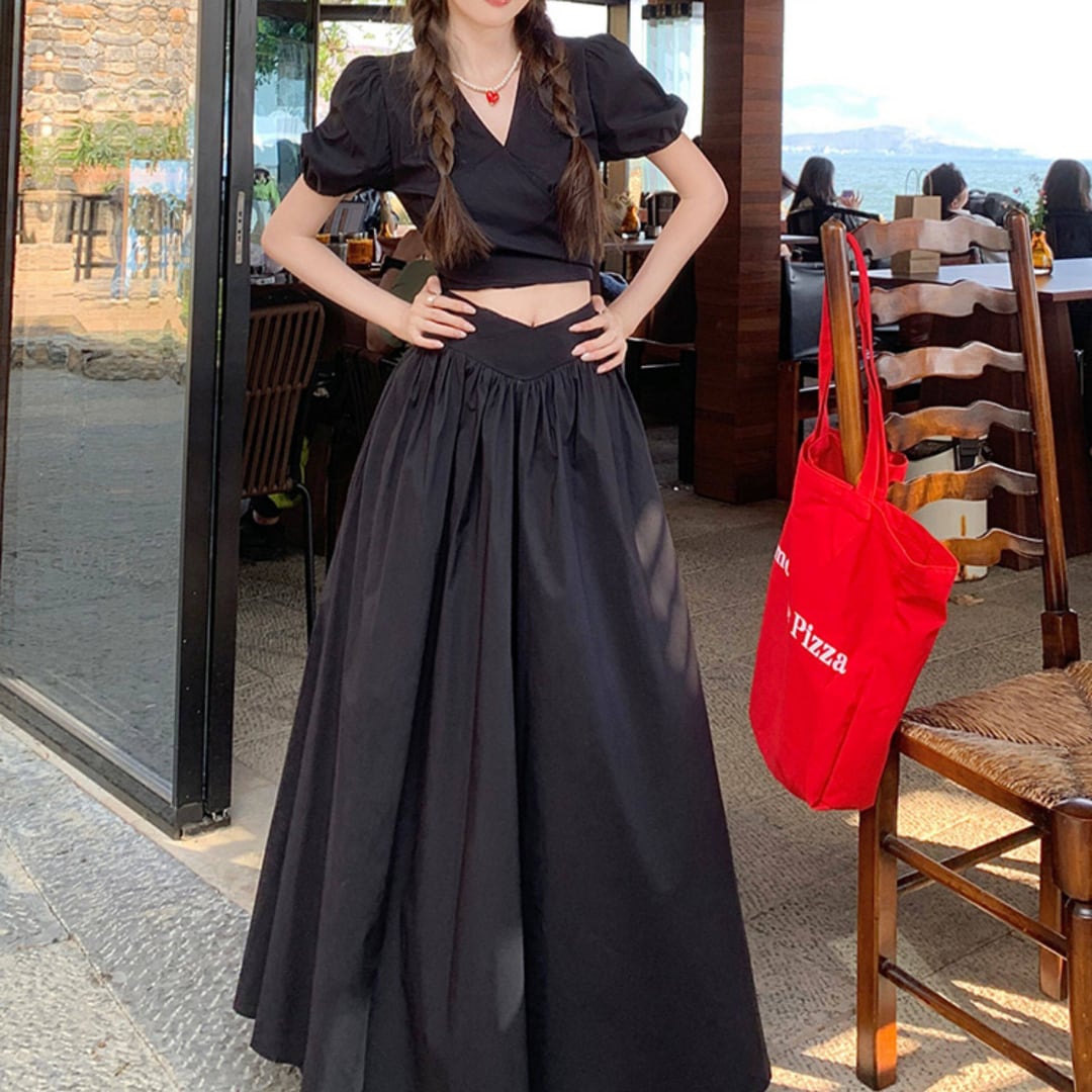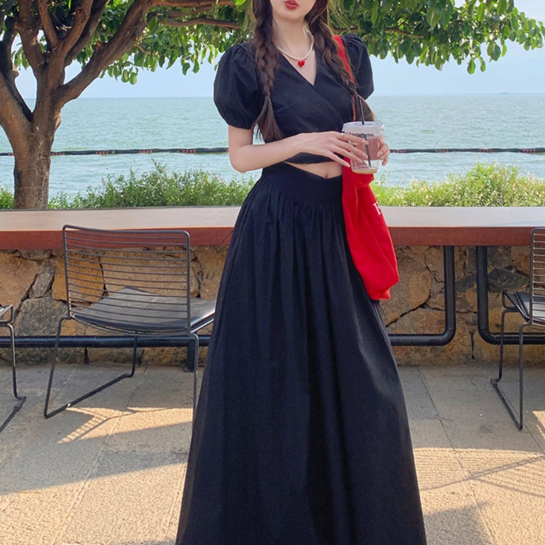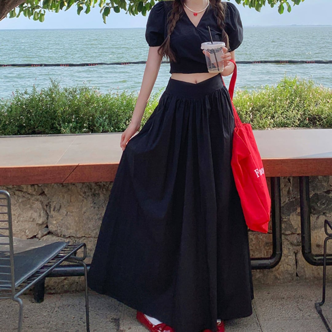 女性らしさを引き立てるパフスリーブトップスとロングスカートのセットアップ。単品でも着回し可能な、洗練されたスタイリングを叶える一着です。