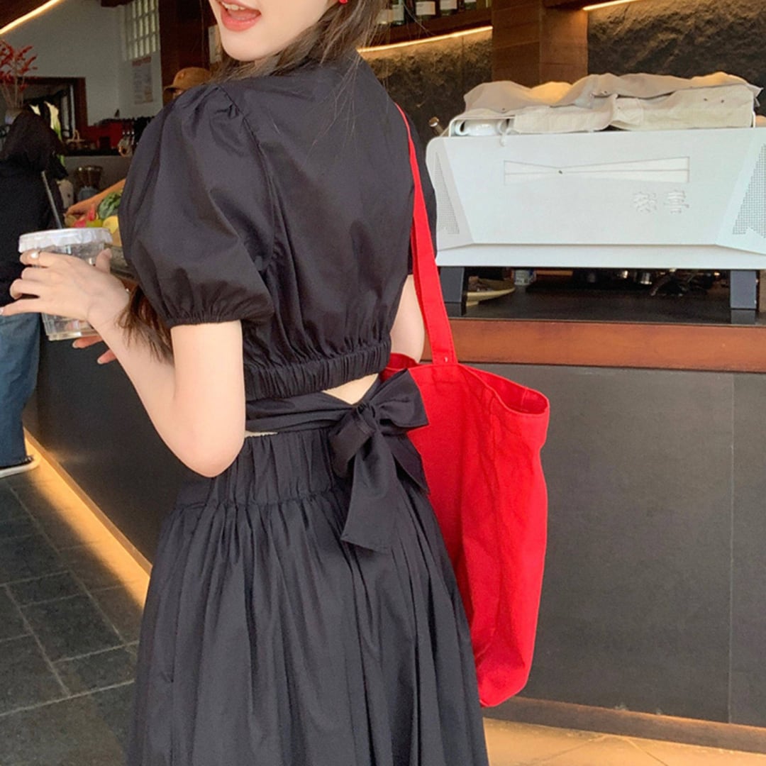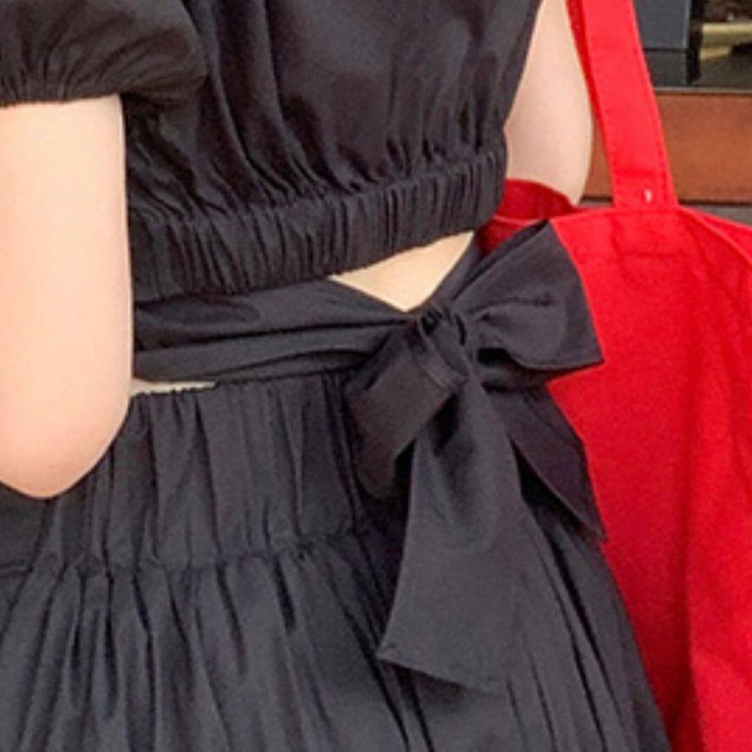 立体感のあるスリーブとコンパクトなトップスが美しいバランスを演出し、スカートはたっぷりとしたフレアシルエットで優雅な動きをプラス。トップスはバックリボン仕様で、後ろ姿まで印象的に仕上げます。