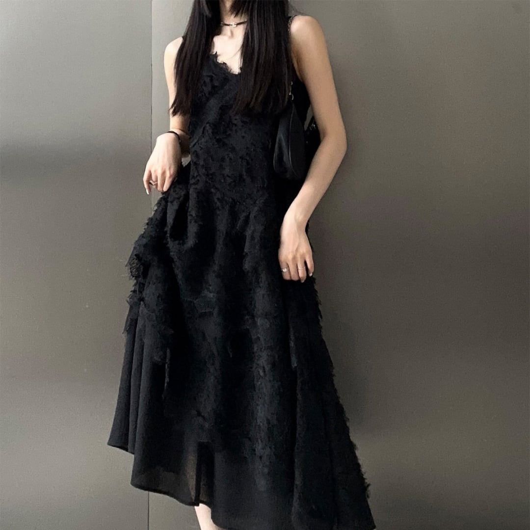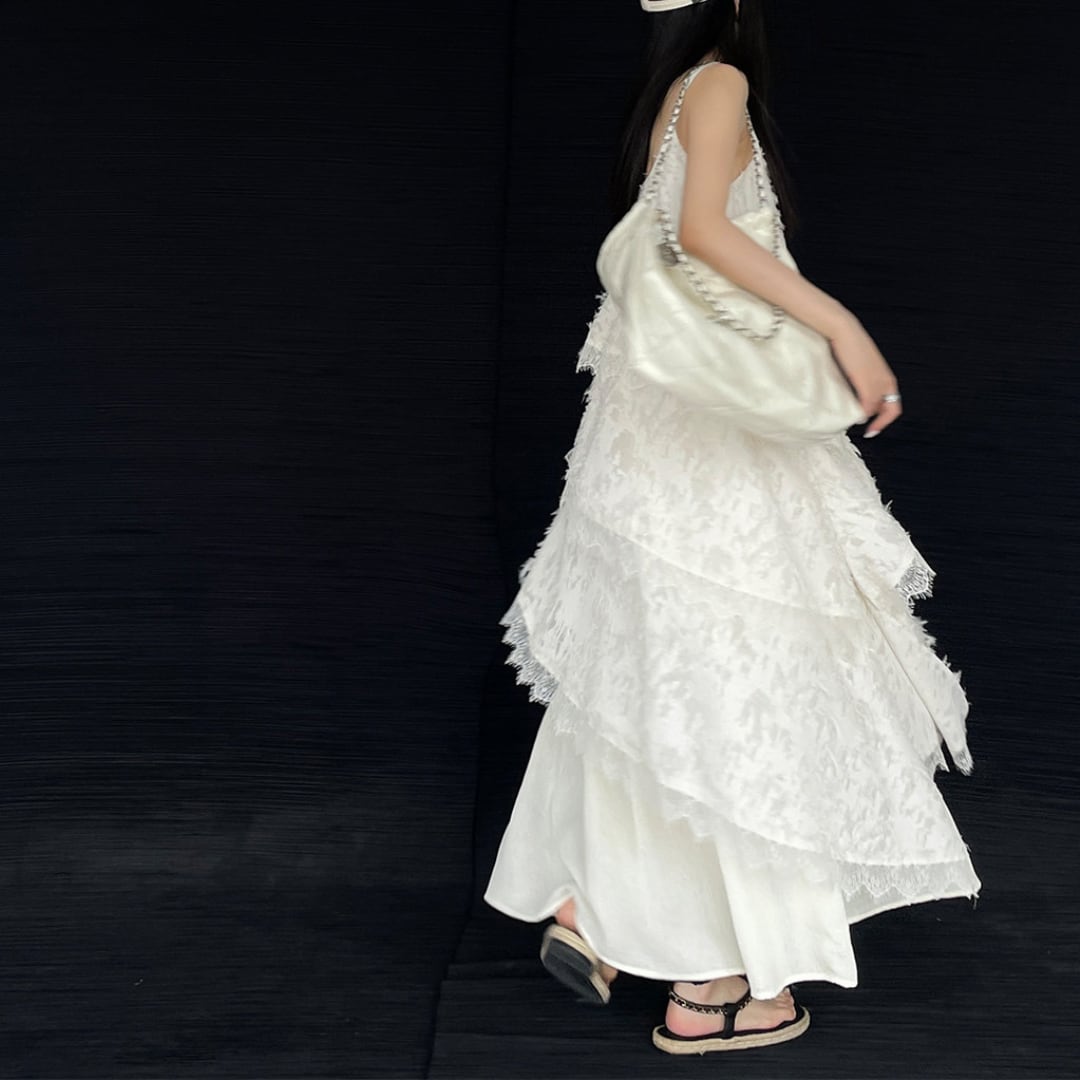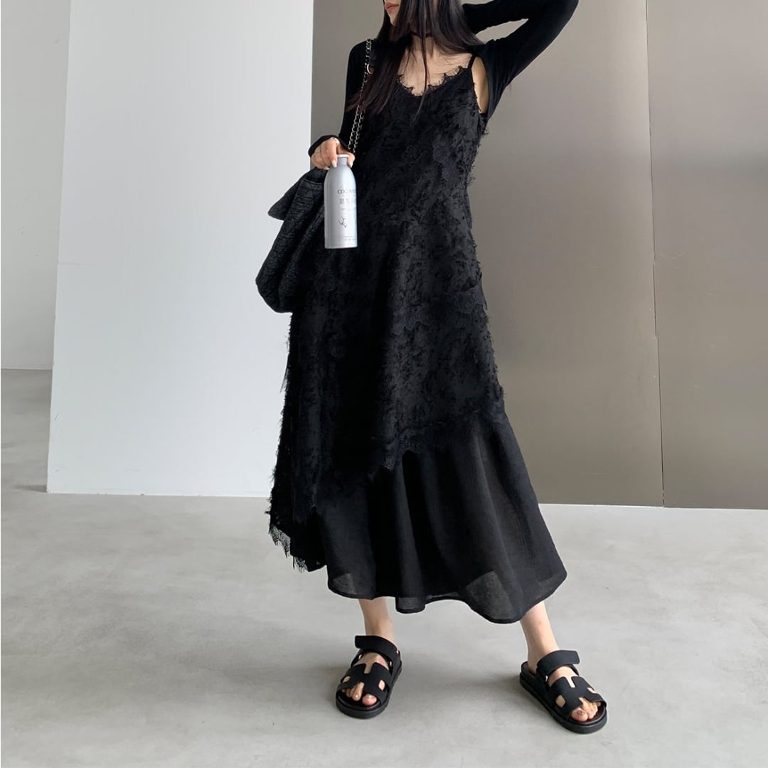 ■商品説明 繊細な表情を持つジャカード素材が印象的な、キャミソールデザインのロングワンピース。軽やかでありながら、存在感のある一着です。 フリンジのような立体的なディテールと、段差をつけたティアードデザインが優雅な動きを演出。華奢なストラップとすっきりとした上身頃が、柔らかなバランスを引き立てます。 広がりすぎないシルエットが身体のラインを自然に整え、縦のラインを意識した構造でスタイルアップ効果も期待できます。 デイリーから特別なお出かけまで、上品さと華やかさを兼ね備えた装いを完成させる一着です。 ■素材 表地:ポリエステル100% 裏地:なし ■カラー アイボリー ブラック ■サイズ S:着丈112cm / 胸囲85cm / ウエスト74cm M:着丈113cm / 胸囲89cm / ウエスト78cm L:着丈114cm / 胸囲93cm / ウエスト82cm ※平置き採寸のため 1〜3cm の誤差があります。 ーーーーーーーーーーーーーーーーーーーーーーーーーーー 【注意事項】 ▪当店ではお求めやすい価格で提供することを心がけ、経費削減として海外倉庫を利用しています。 そのため、お取り寄せ商品は14〜30営業日前後いただく場合がございます。 ▪︎送料は北海道・沖縄・離島以外1000円、北海道・沖縄・離島は1500円頂戴しております。 ▪︎お買い上げ10,000円以上の場合、送料は無料です。 ▪︎こちらは海外製造の商品です。日本基準ではございませんので、作りがあまい場合がございます。 ▪︎お手持ちのPCやスマートフォンの画面により商品の色に若干の差がございます。 ▪︎イメージの違いやサイズ交換等、お客様の都合による交換、返品の対応はできかねます。 詳細は『ご購入前に必ずお読みください』を確認のうえご購入をお願いします。 https://www.amoratokyo.jp/blog/2023/11/01/011701