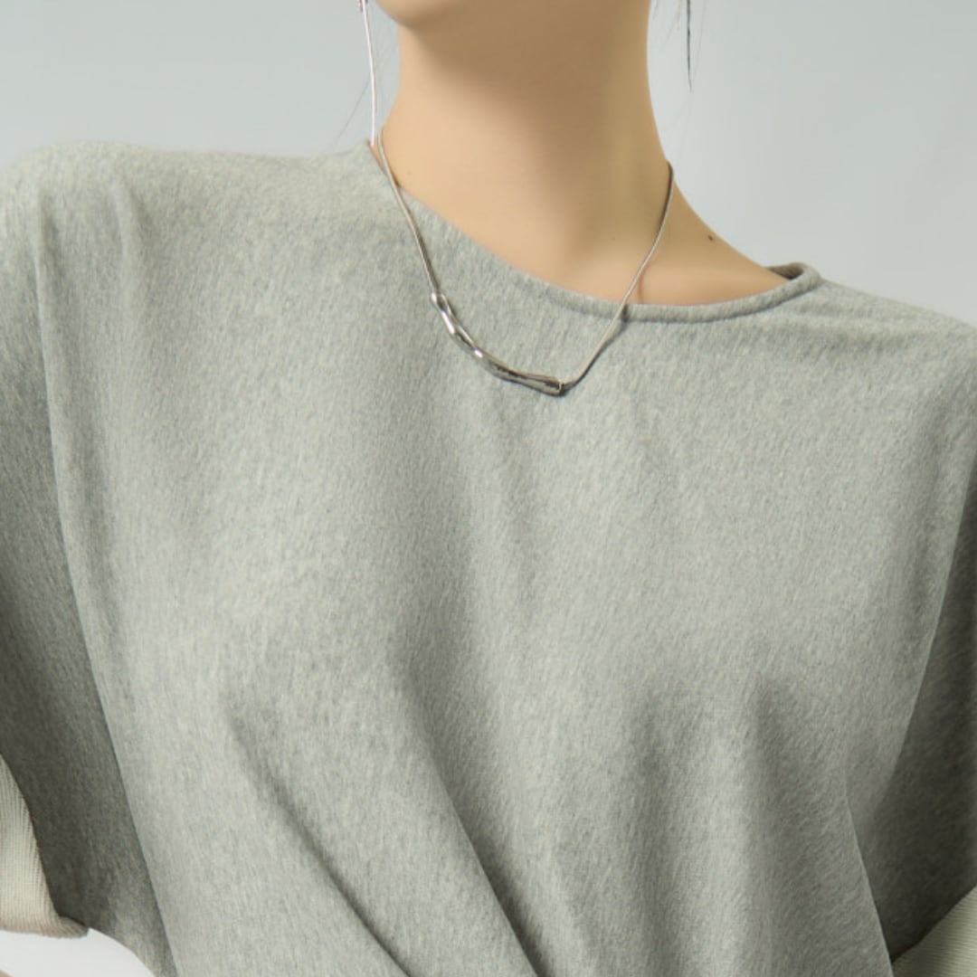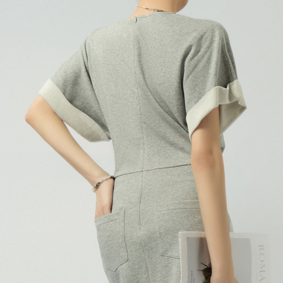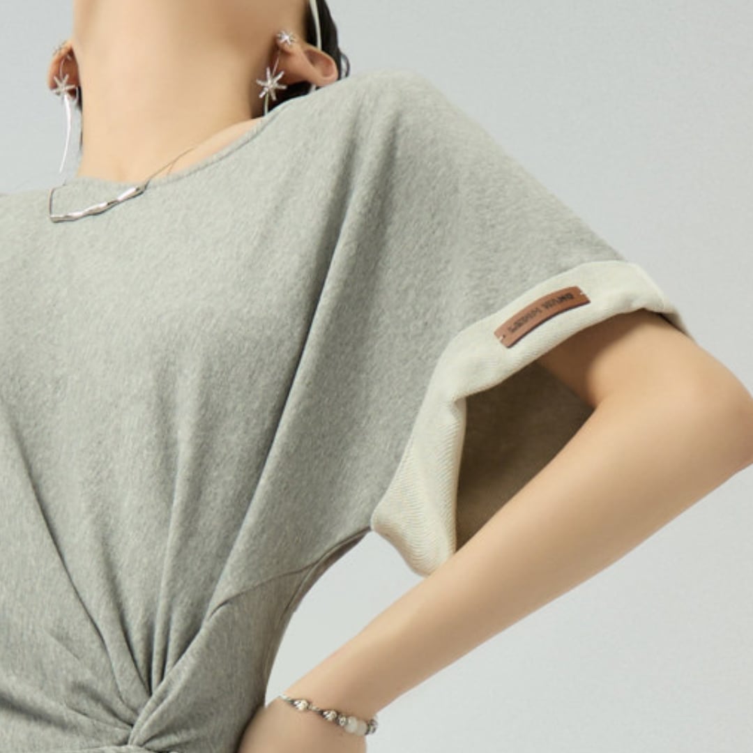 ウエストに施されたドレープデザインが立体感を生み、自然なメリハリを演出。クルーネックと半袖のミニマルなディテールが、全体をバランスよく引き締めます。