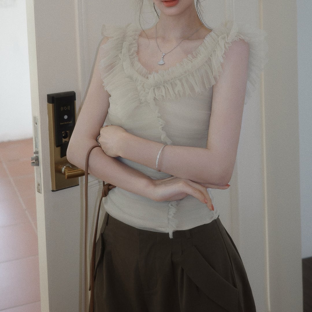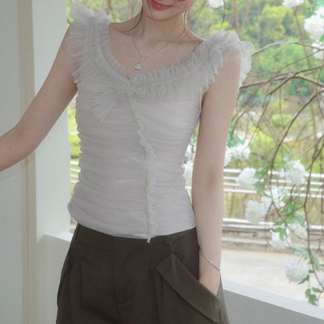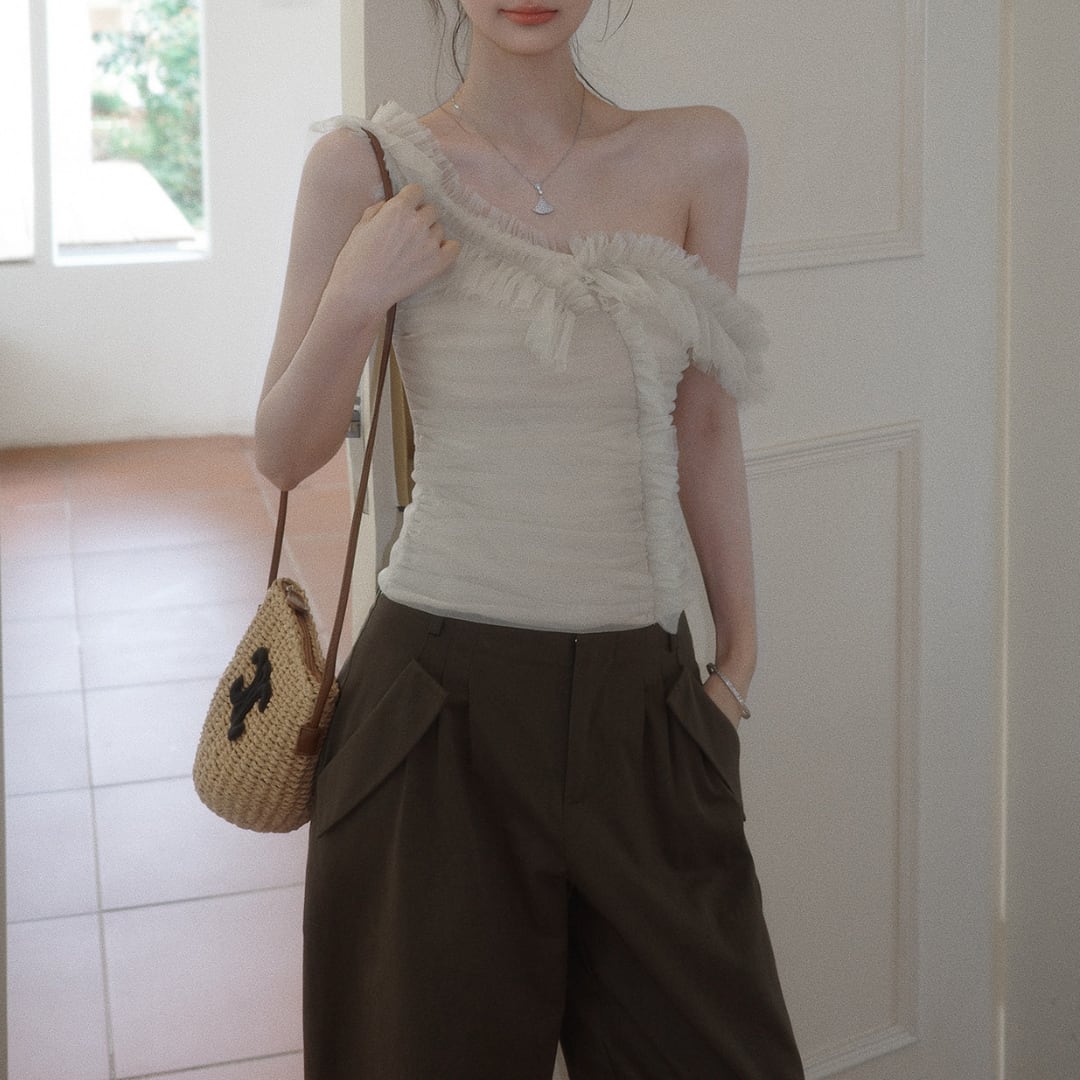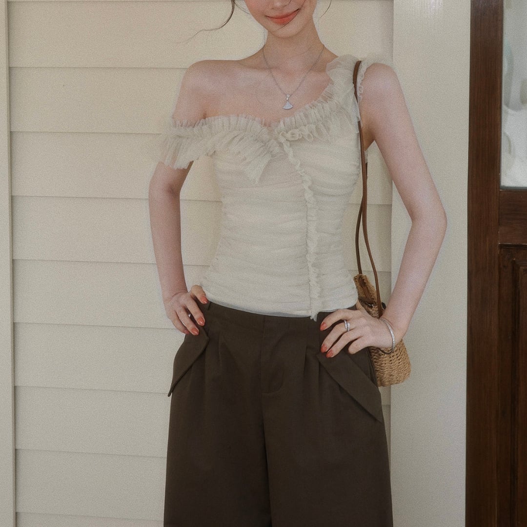 繊細なフリルとギャザーが印象的な、オフショルダーデザインのトップス。柔らかな女性らしさを引き立てる一着です。