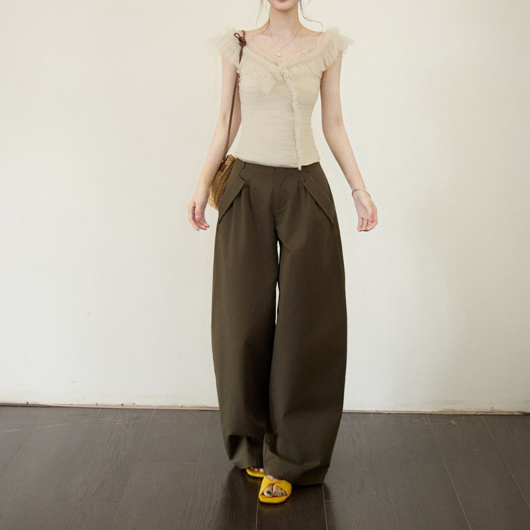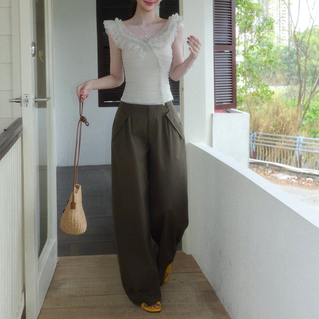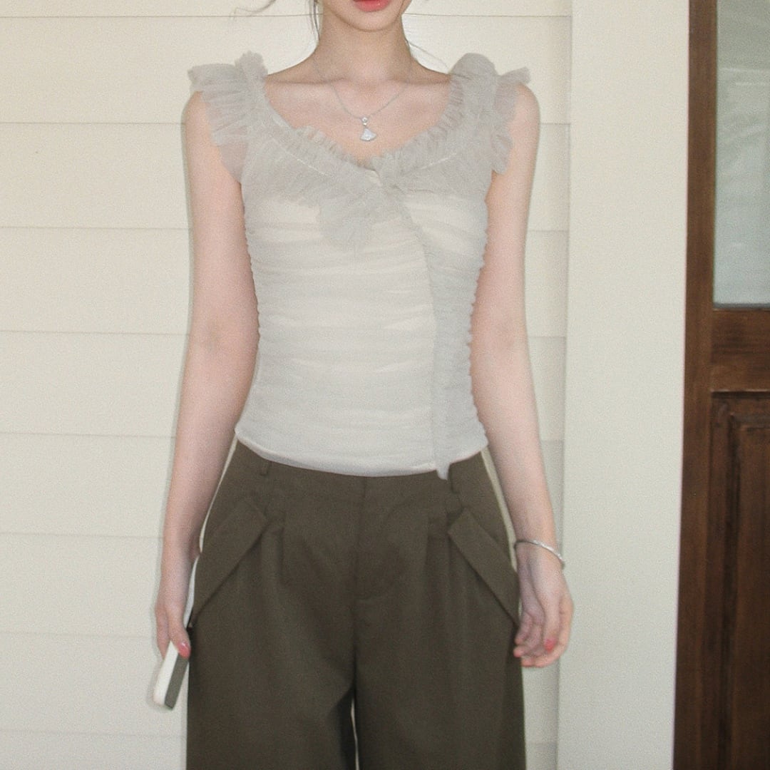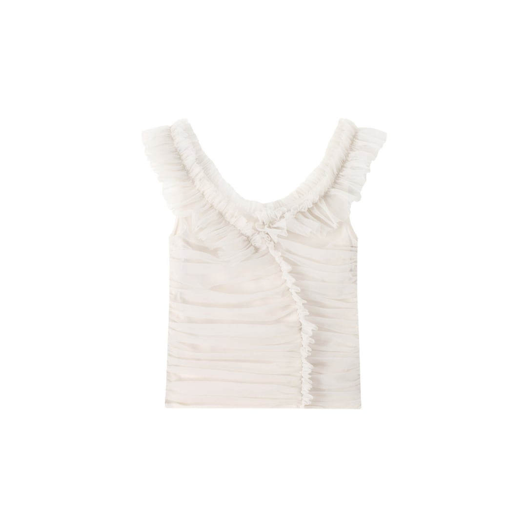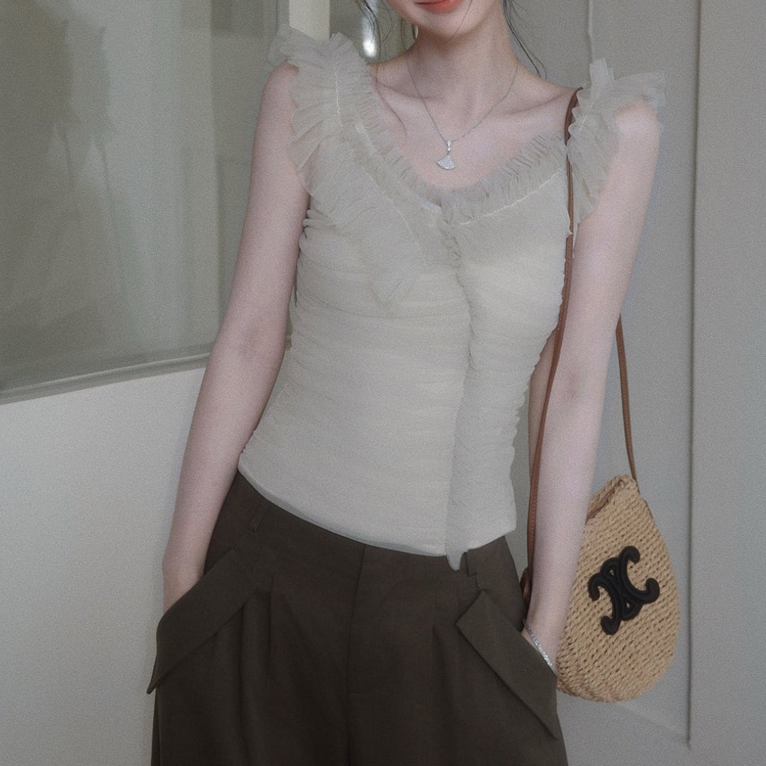繊細なフリルとギャザーが印象的な、オフショルダーデザインのトップス。柔らかな女性らしさを引き立てる一着です。