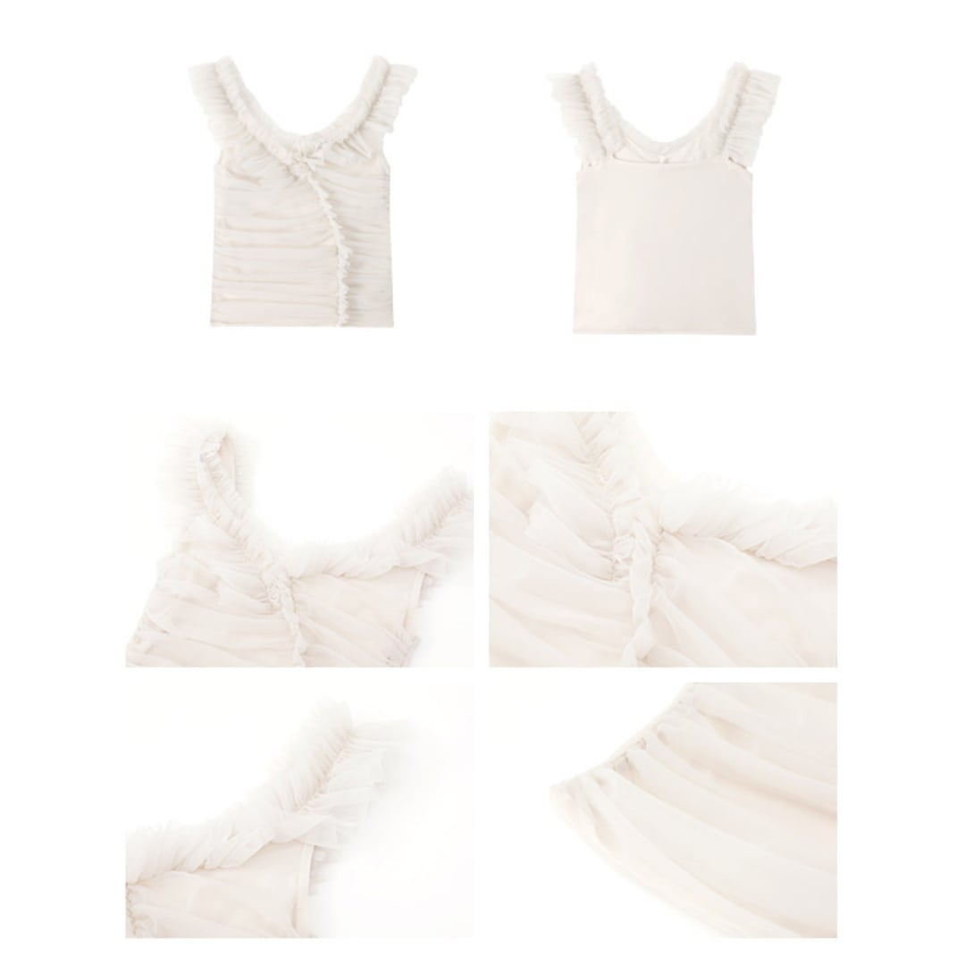 デコルテを美しく見せるネックラインと、立体的に重なるフリルディテールが華やかさを演出。コンパクトなシルエットが上半身をすっきりと見せ、洗練された印象へと導きます。