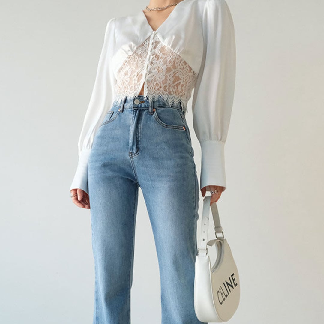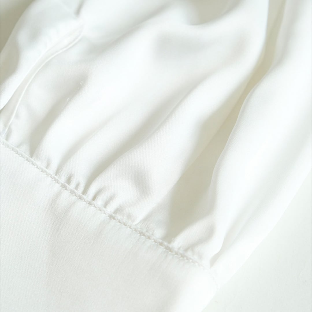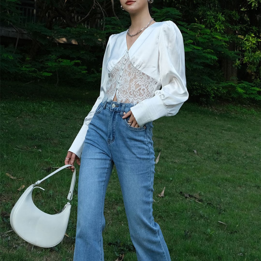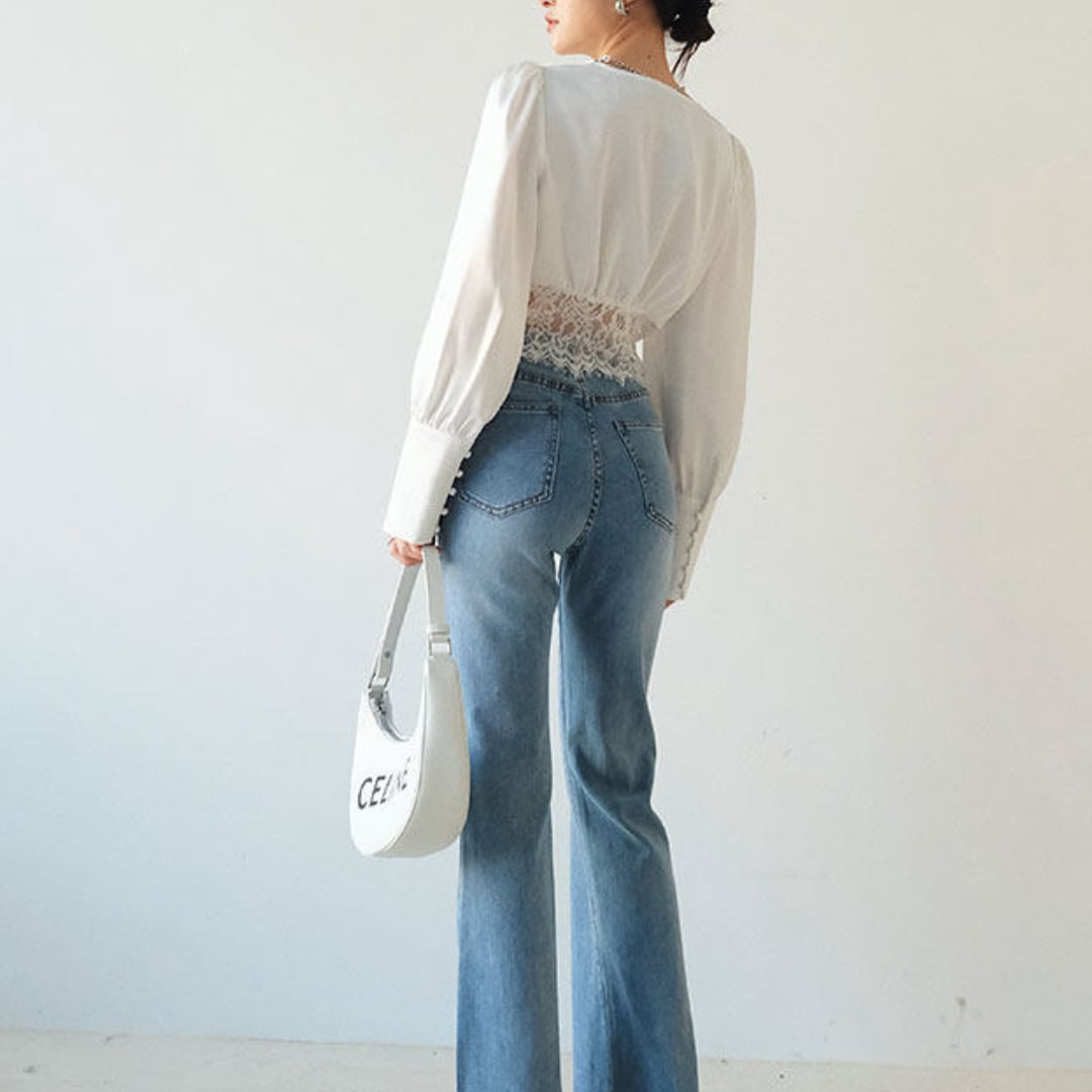 デコルテを美しく見せるVネックと、立体感のあるパフスリーブが印象的。ウエスト部分にあしらわれたレース切替が、軽やかな抜け感と奥行きを演出します。