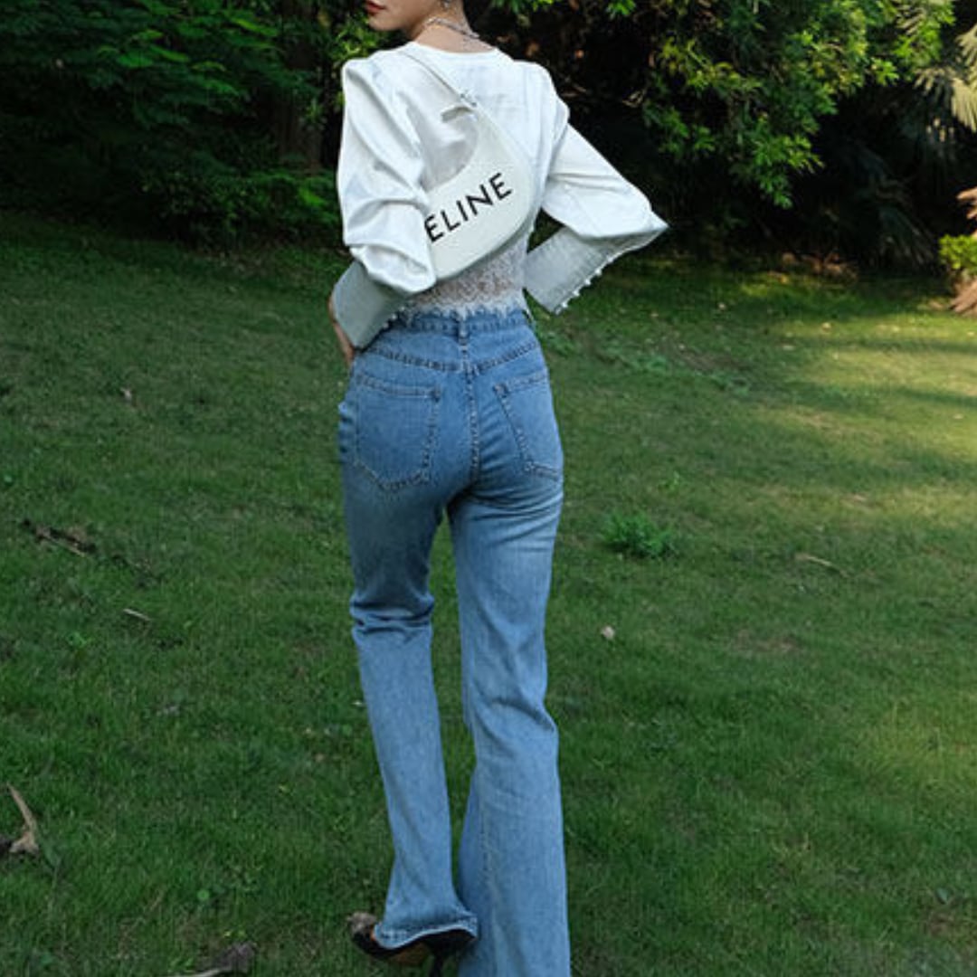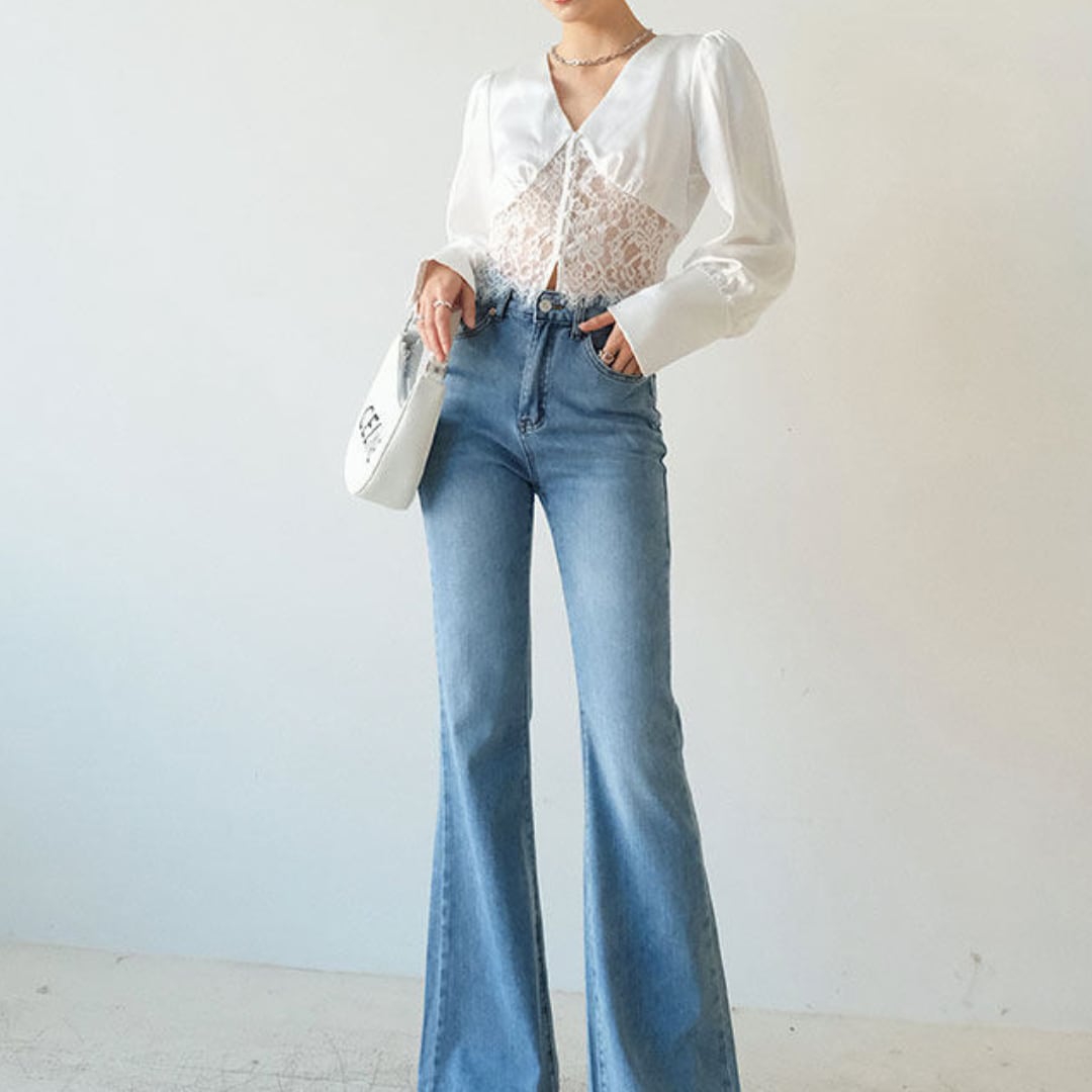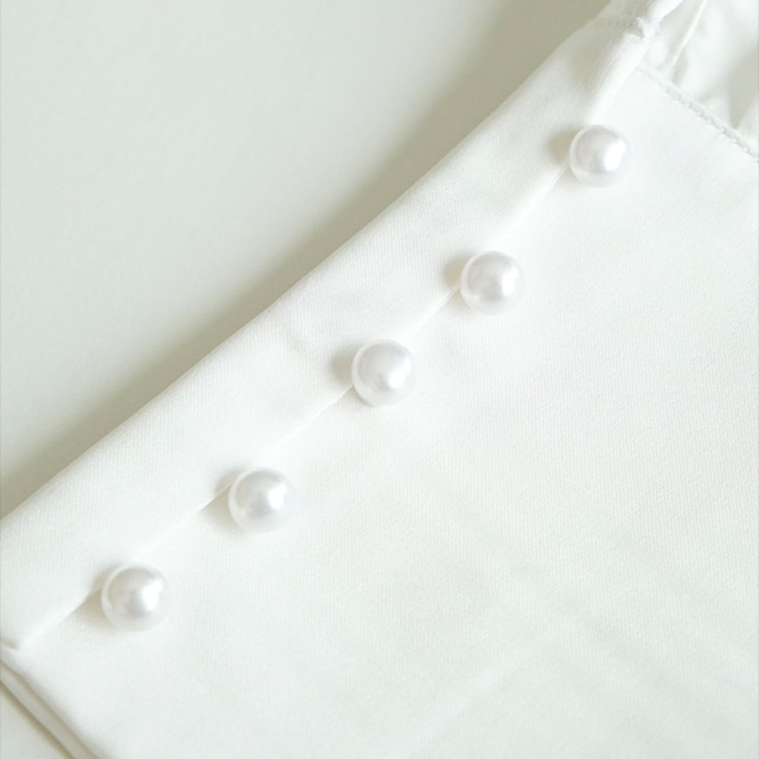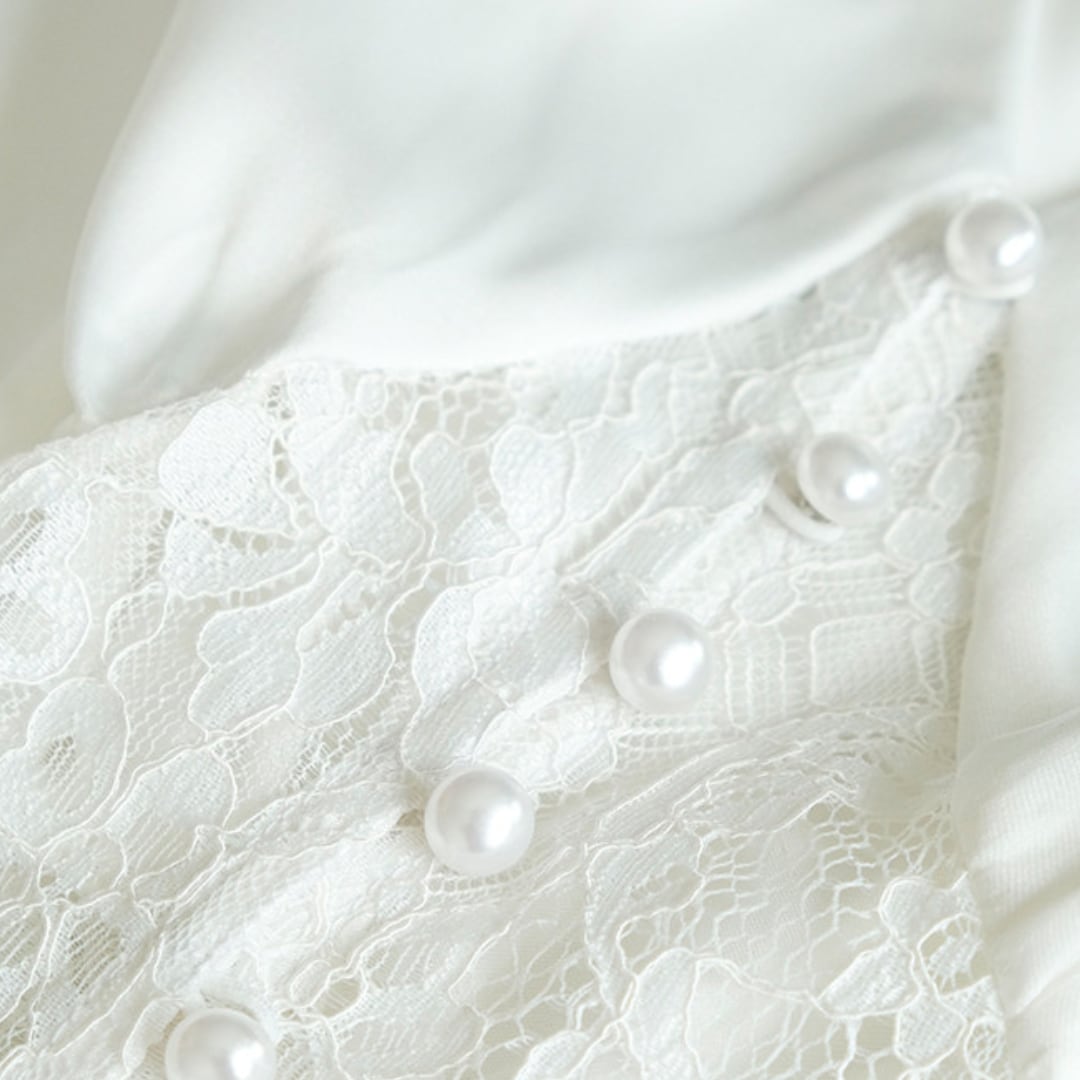 デコルテを美しく見せるVネックと、立体感のあるパフスリーブが印象的。ウエスト部分にあしらわれたレース切替が、軽やかな抜け感と奥行きを演出します。